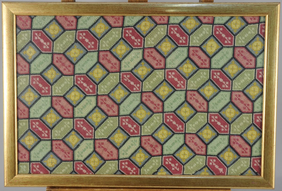 TAPISSERIE au point. Motifs géométriques.Début XIXème. 42 x 27 cm.Encadrée.