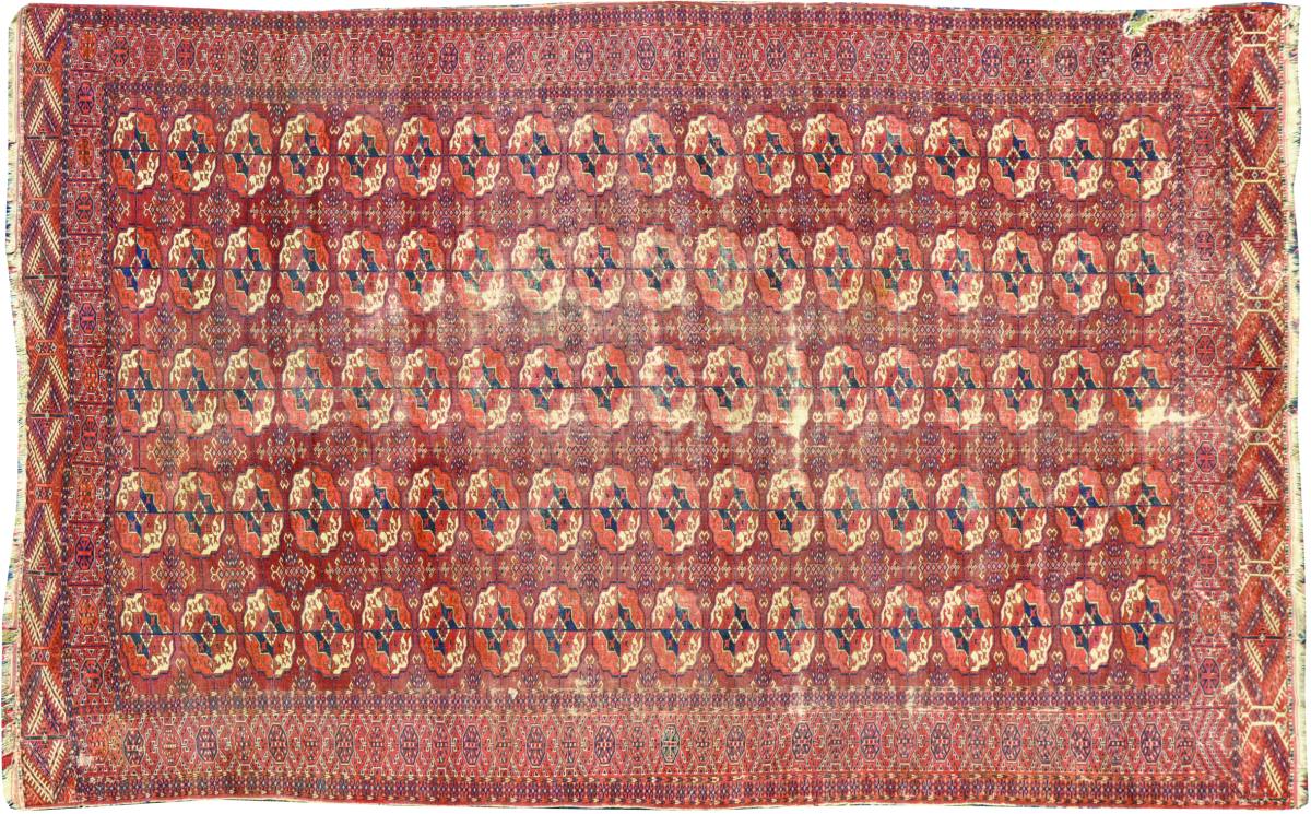 TAPIS Boukhara ancien en laine à motifs de gühl, frise géométrique. 422 x 268 cm. (accidents, manques, réparations).