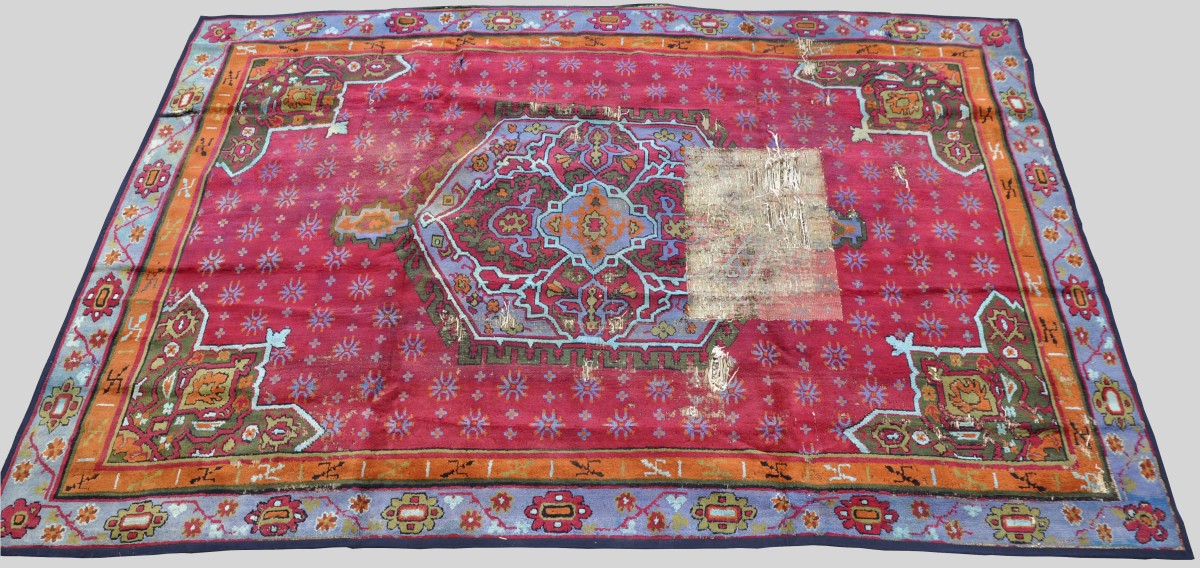 TAPIS d'Asie mineure, Sarouk (?) en laine à motif de médaillon losangique sur fond rouge. Champ rouge étoilé. 460 x 305 cm. (accidents, manques, réparations).