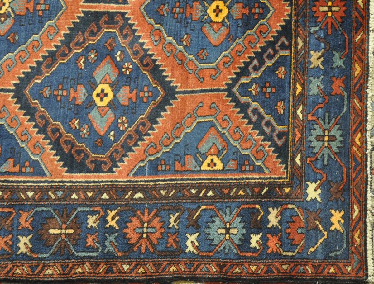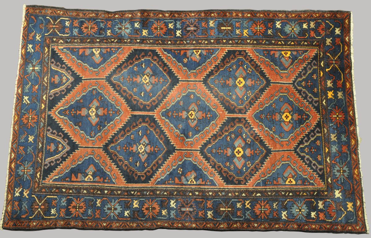 TAPIS en laine à motif de losanges rouges sur fond bleu. Caucase, Kazak? XXème. 196 x 130 cm.