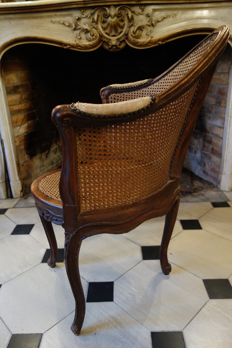 Élégant FAUTEUIL DE BUREAU en hêtre teinté de forme violonée à dossiers et assise canné. Le dossier de forme gondole, les accotoirs à manchettes terminés par des enroulements à l'amorce d'un "coup de fouet" maîtrisé. La ceinture et le raccordement des trois pieds antérieurs sculptés de filets et de fleurettes. Il repose sur quatre pieds galbés, nervurés terminés en escargot.