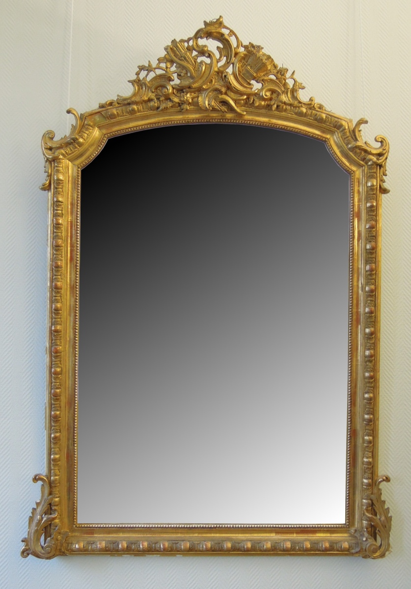 MIROIR en bois stuqué et doré à décor de rangs de perles, d'oves et de palmes aux angles. Le fronton est orné des attributs de l'Amour: carquois, arc et flambeau.