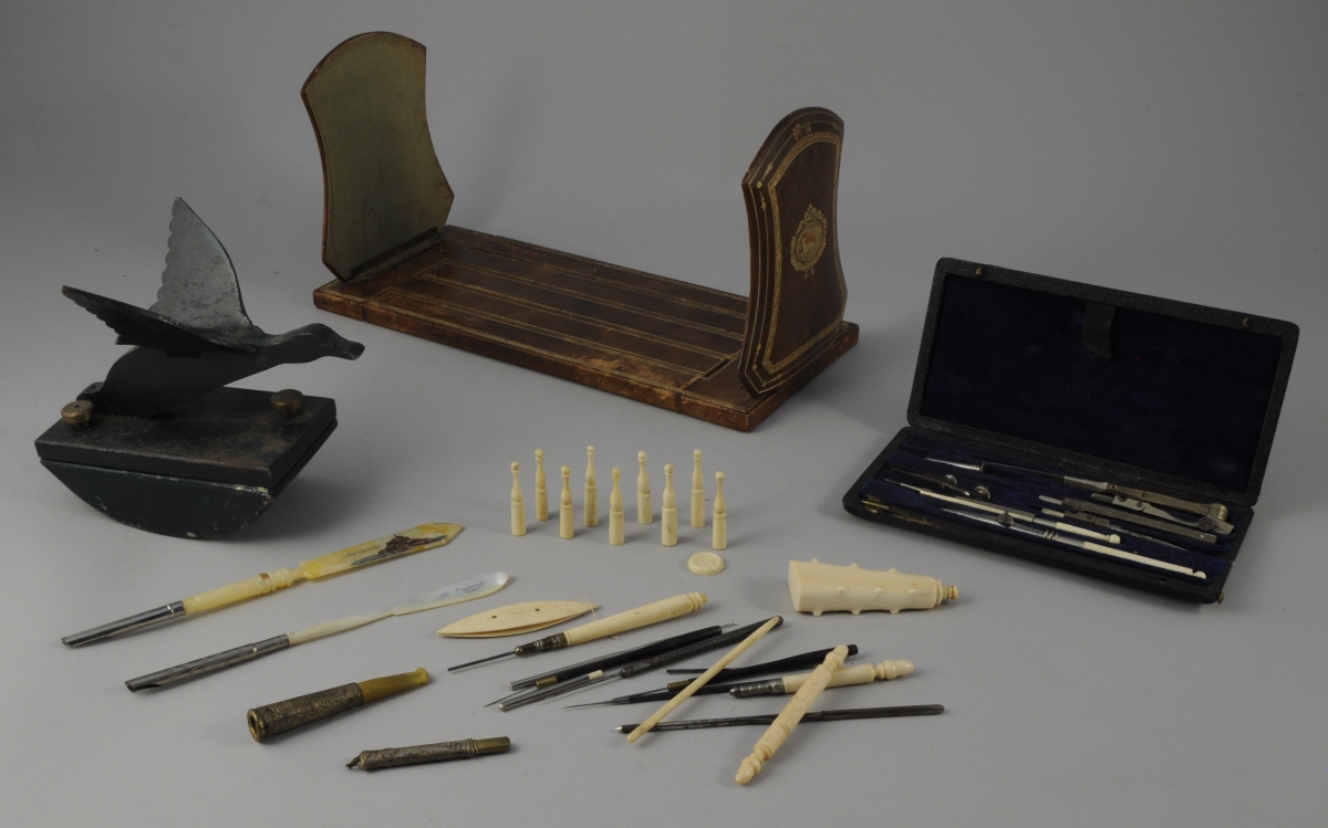 - PORTE-PLUME et éléments en os, ivoire et métal. Dans une boîte cartonnée. XXème. (usures)
