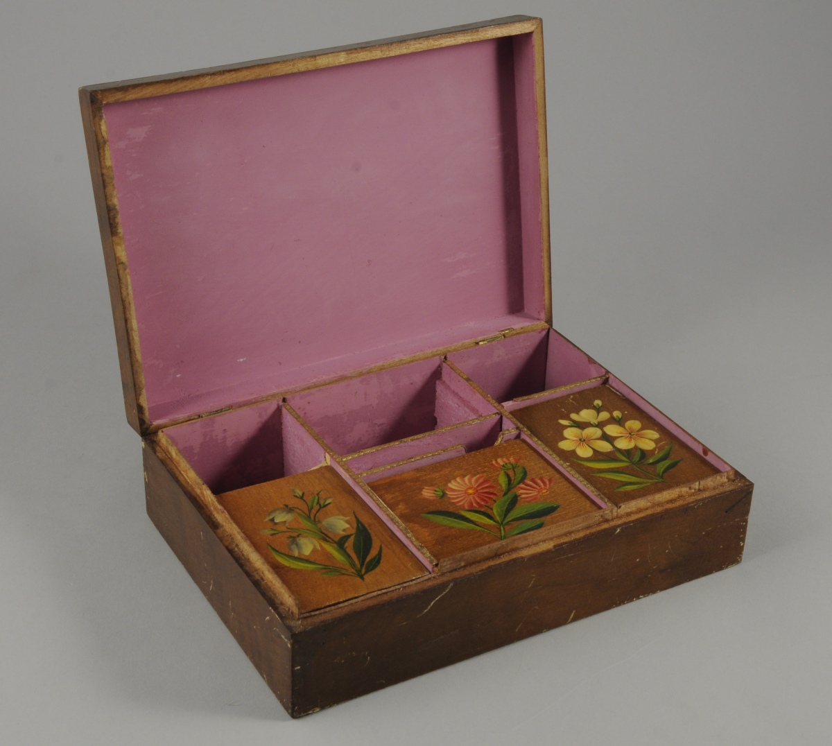 BOÎTE à OUVRAGE en bois à décor polychrome peint de bouquets de fleurs. L'intérieur compartimenté. Début XXème. Haut. 6, Larg. 20, Prof. 14 cm. (manques, usures)