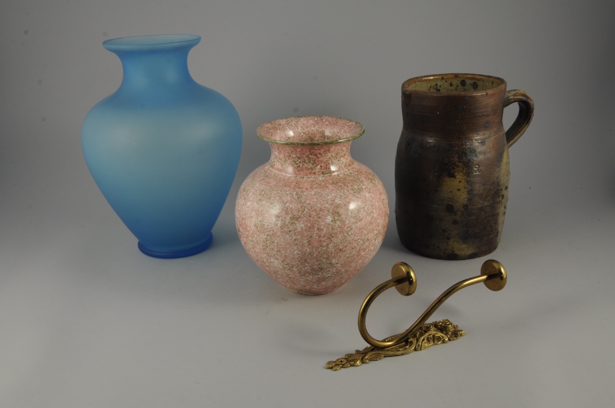 - VASE balustre en faïence fine. Décor "à l'éponge" rose et vert. Signé "Pécout". Haut. 21 cm.