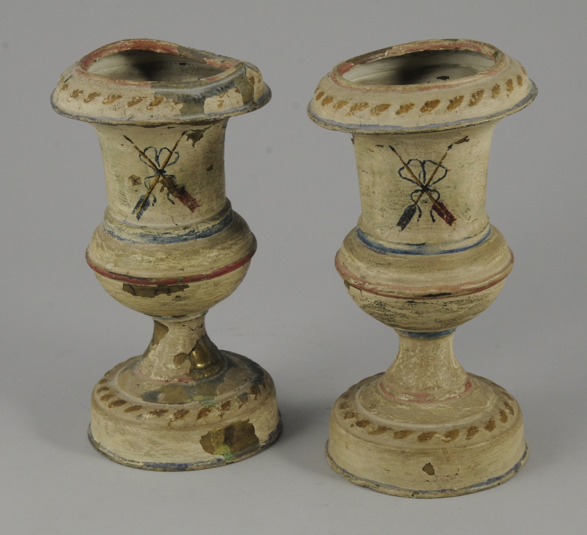 PAIRES DE VASES MÉDICIS en tôle peinte de couleur crème et filets bleus et rouges. Décor de cordelettes et de deux flèches nouées. XIXème. Haut. 17, Diam. 8,5 cm.