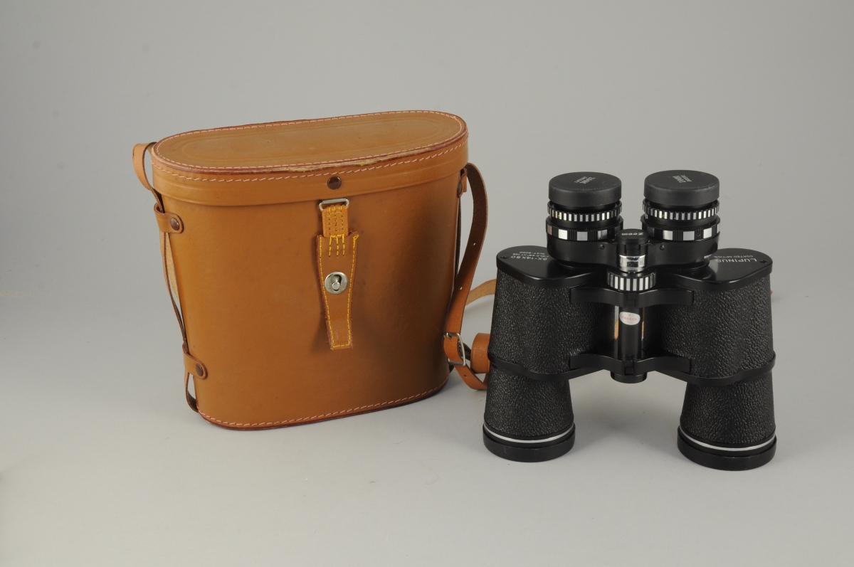 PAIRE de JUMELLES LUPINUS. "8X - 14 X 50 FIELD 4,8° AT 14X N) 47 - 6000". Dans un étui en cuir fauve.