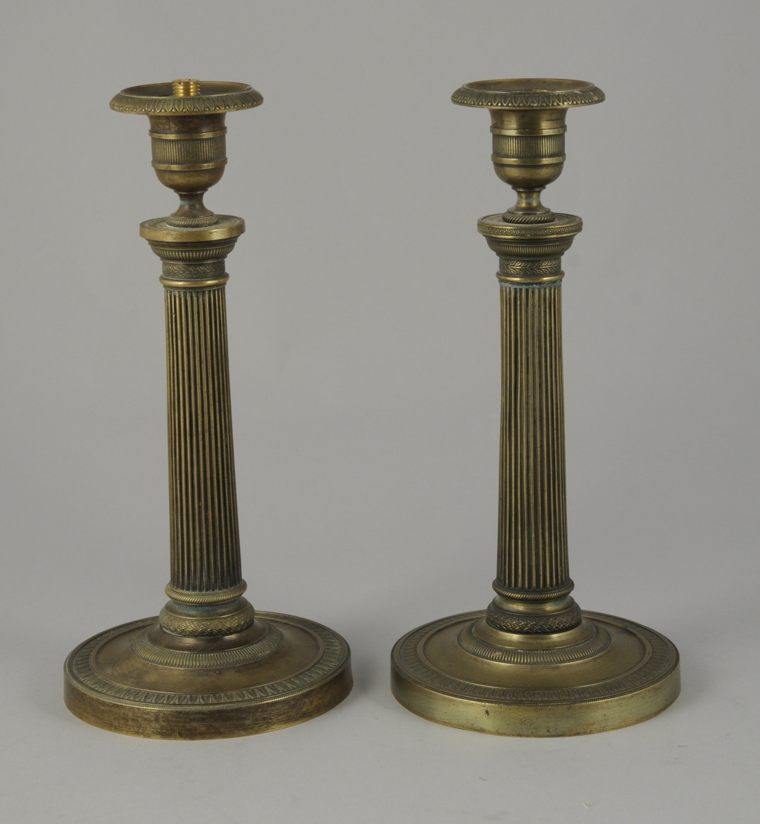 PAIRE de FLAMBEAUX en laiton ciselé. Le pied à décor de feuilles d'eau et godrons. Le fût cannelé orné de tores de laurier, godrons, bagues, feuillages et entrelacs. Bobèches ornées de feuilles d'eau. Montés à l'électricité.