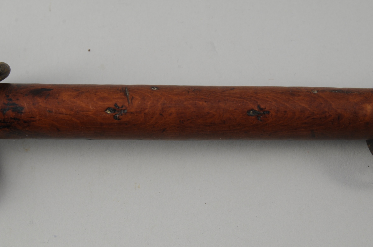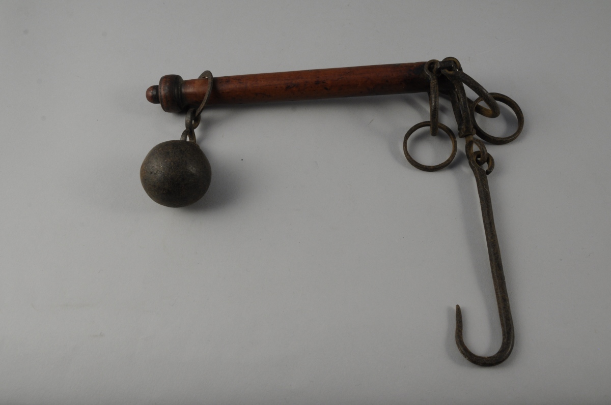 BALANCE romaine, fléau en bois à 2 fleurs de lys, poids, anneaux et crochets acier. Long. 20 cm.