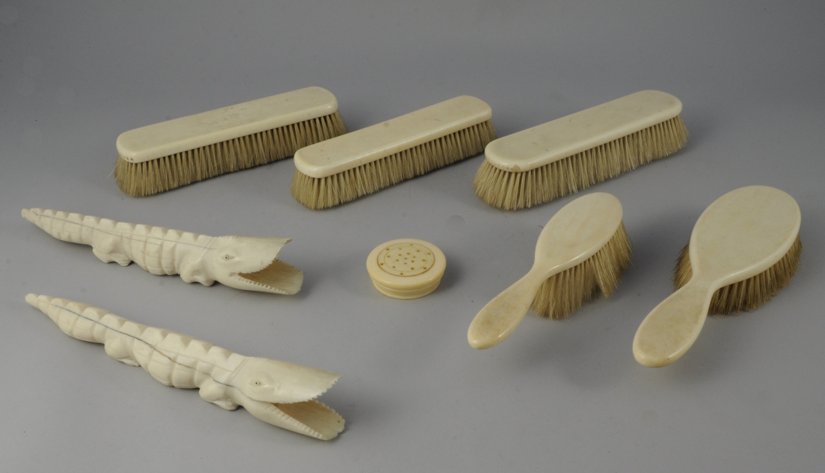 Cinq BROSSES en ivoire et soie et deux CROCODILES en ivoire. XIXème/XXème.
