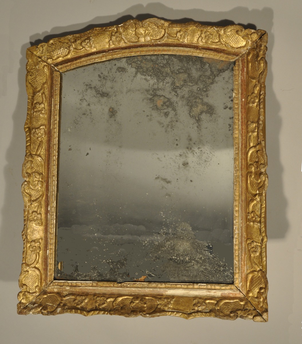 MIROIR rectangulaire en bois stuqué et doré. Traverse haute légèrement cintrée. Décor d'agrafes et guirlandes de fleurettes.