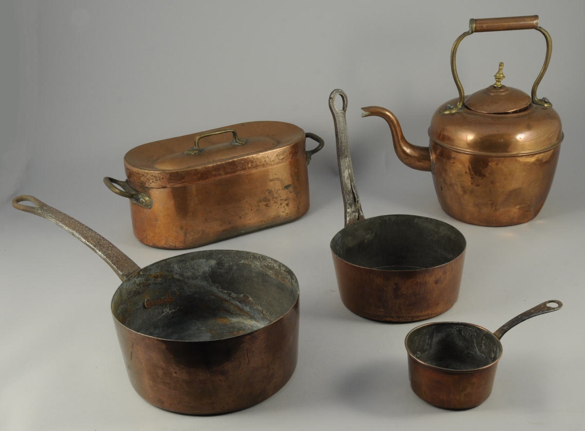 XIXème. Diam. de la plus grande casserole, 21 cm. (usures d'usage)