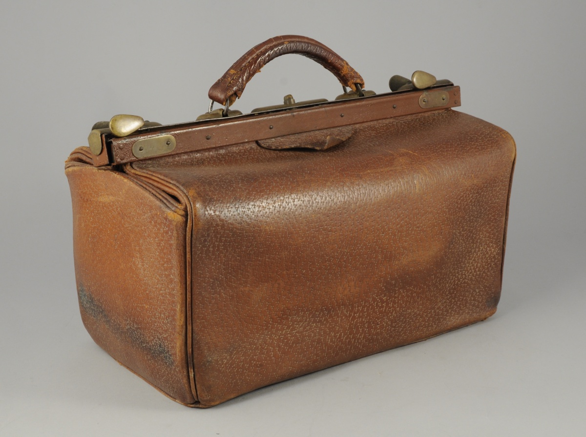 SACOCHE de forme oblongue en cuir de porc brun. Garnitures de fer laqué brun et de laiton. L'intérieur garni de tissu jaune.