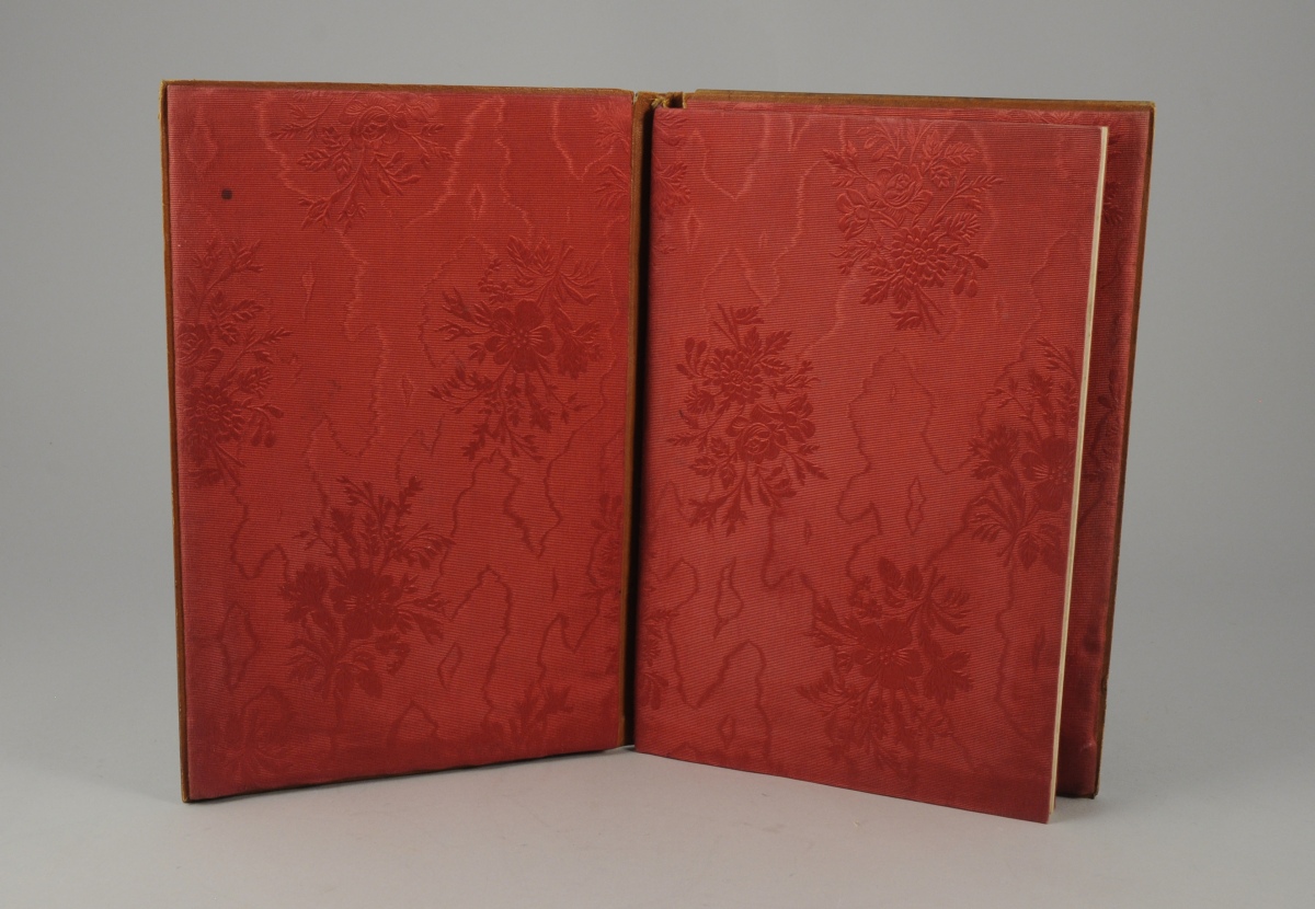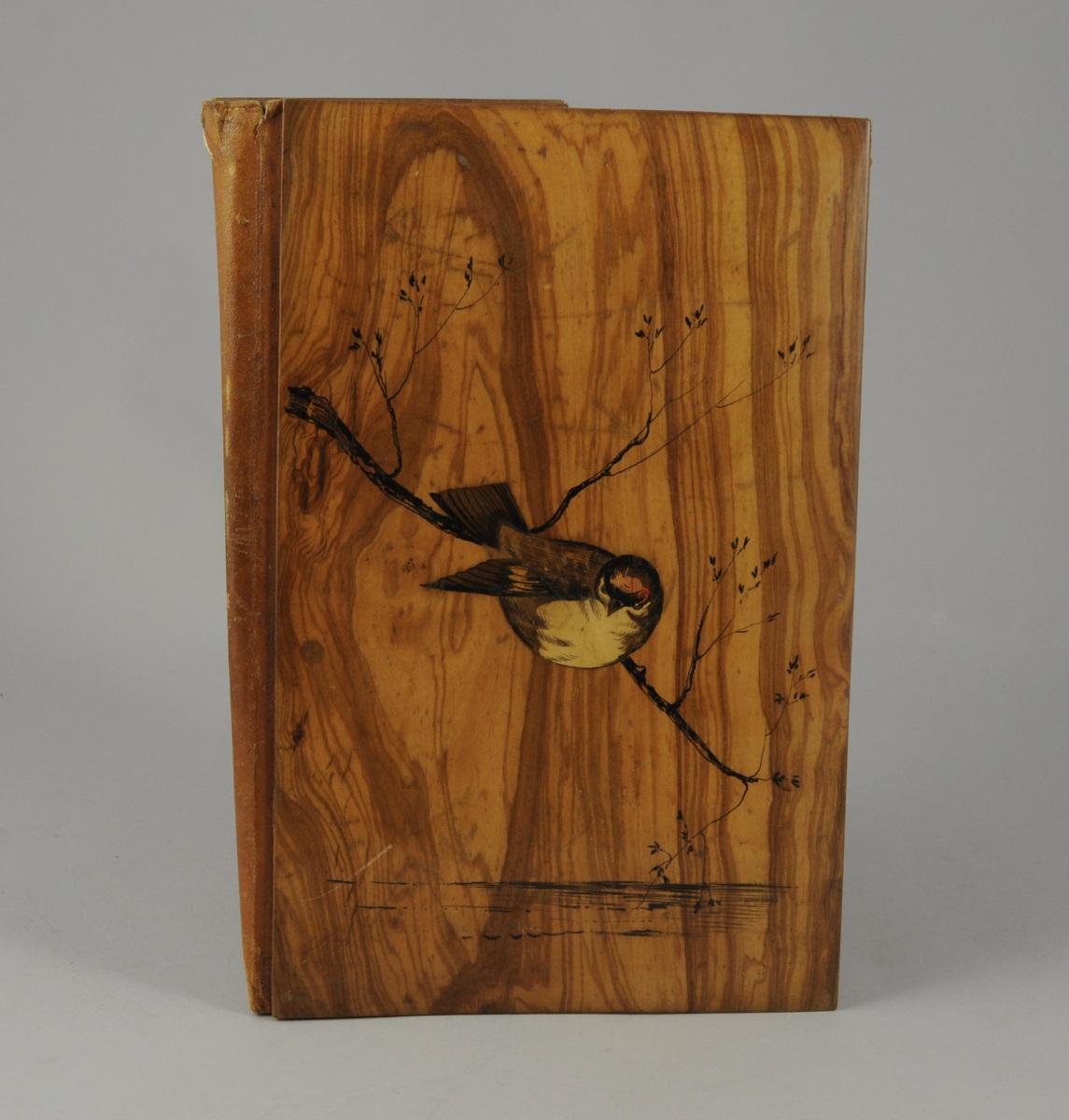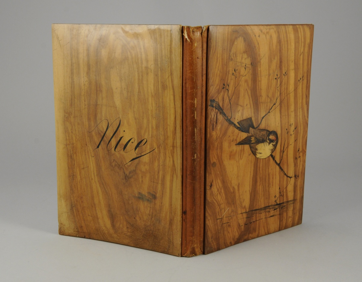 ÉTUI DE CARNET en olivier marquetté et peint d'un oiseau branché sur le plat supérieur et marqué "Nice" sur le plat inférieur. Dos de cuir brun et intérieur compartimenté garni de tissu rouge.