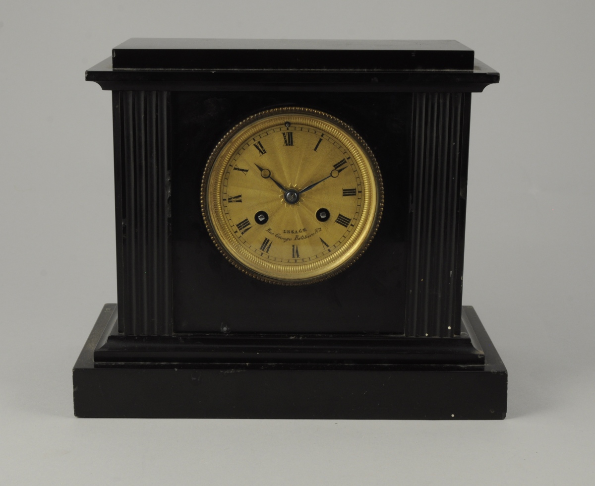 PENDULE BORNE rectangulaire en marbre noir à décor de moulures et pilastres cannelés. Cadran circulaire émaillé or affichant les heures en chiffres romains, marqué "LESAGE / Rue Grange Batelière N°2".