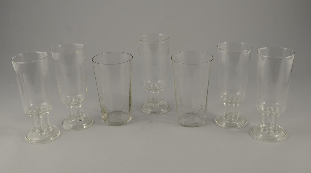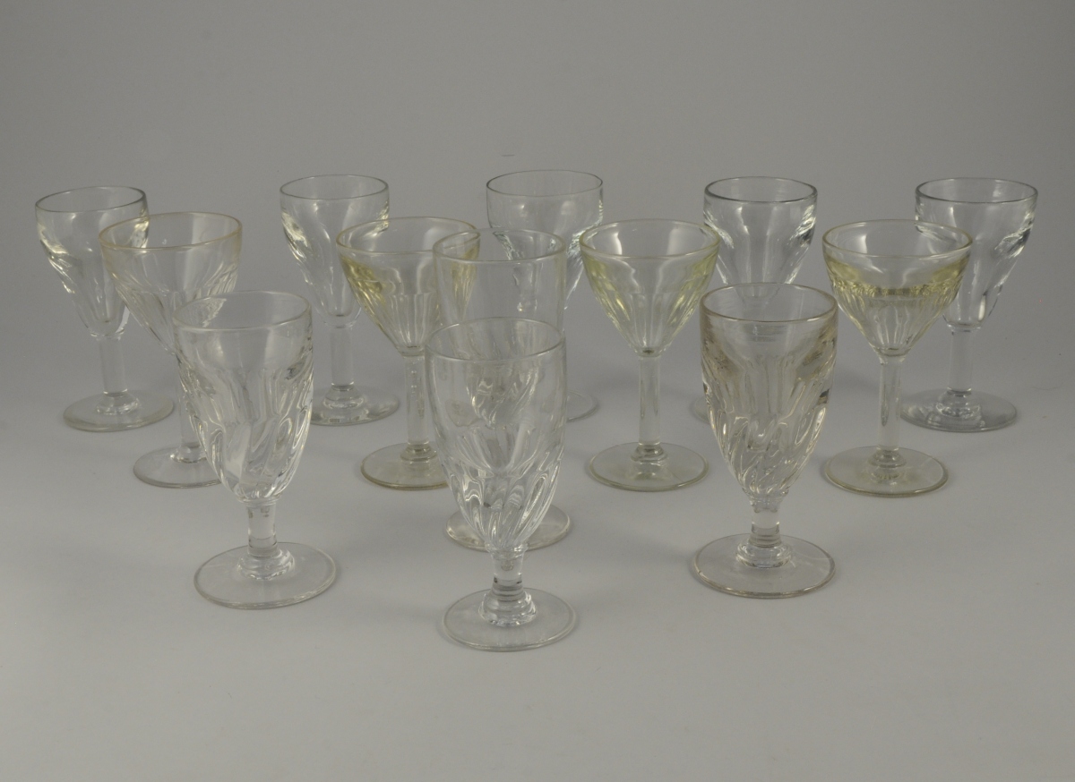 LOT de 30 VERRES comprenant: 4 flûtes à champagne en cristal, 5 verres à vins en cristal au pied givré représentant Bacchus, 5 verres à vin, 4 verres à vin facetté légèrement teintés vert, 1 verre à vin facetté, 3 verres à eau facettés, 1 verre à eau facetté, 5 verres à bière au pied formé de quatre colonnes et 2 verres à orangeade. XXème. Haut. des flûtes à champagne 16 cm.