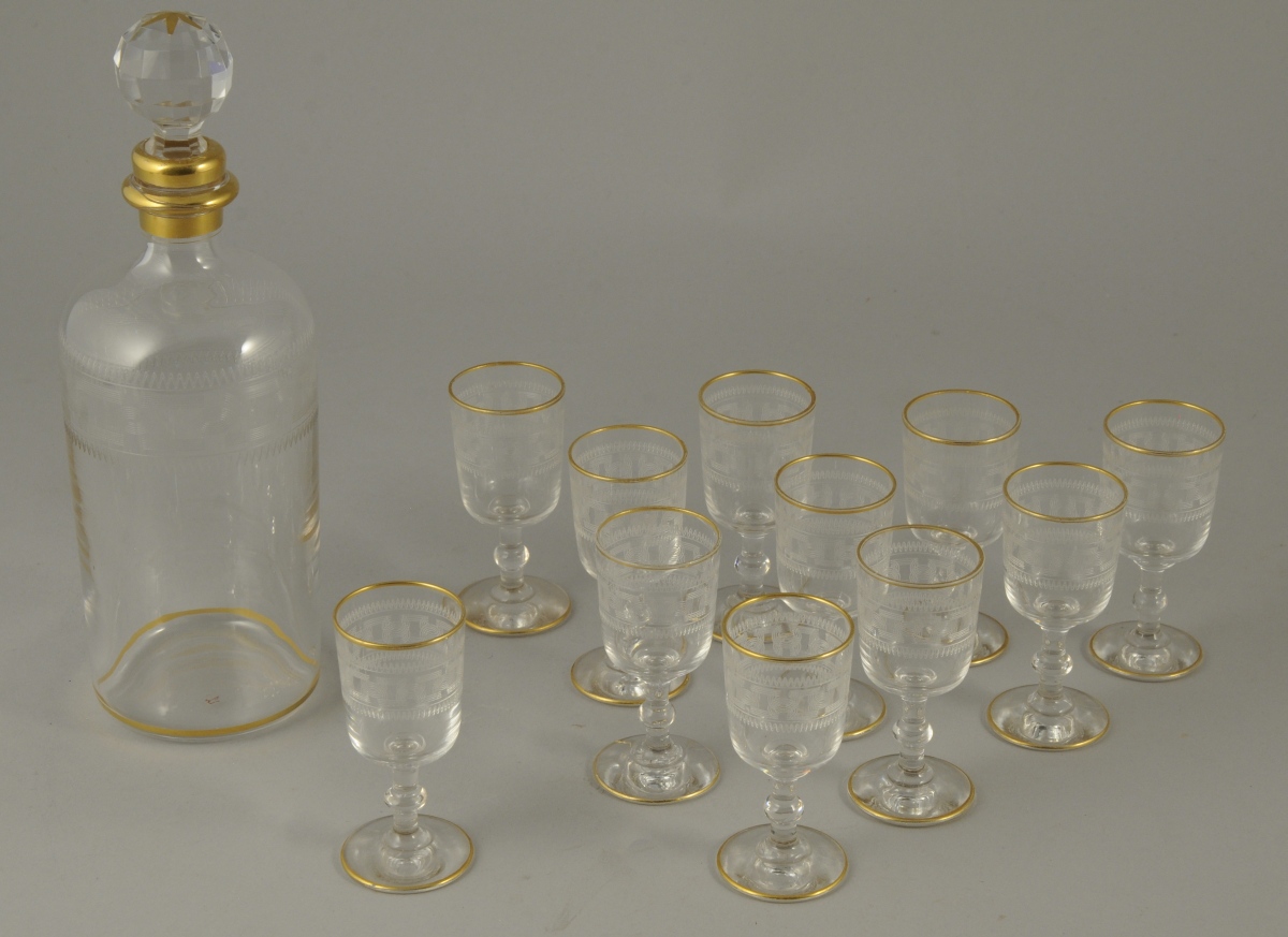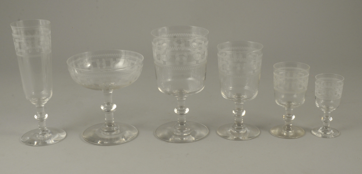 PARTIE de SERVICE de 90 pièces en cristal à décor gravé de frise d'entrelacs, le pied balustre, comprenant 1 carafe à décor de filets or et bouchon facetté, 16 coupes à champagne, 17 verres à vin, 1 verre, 3 flûtes à champagne, 37 verres de trois tailles différentes, 4 verres à liqueur et 11 verres à liqueur à décor de filets or.