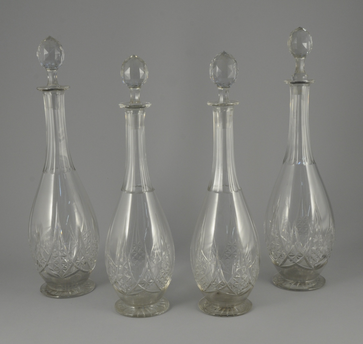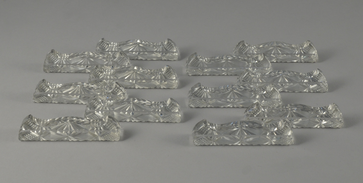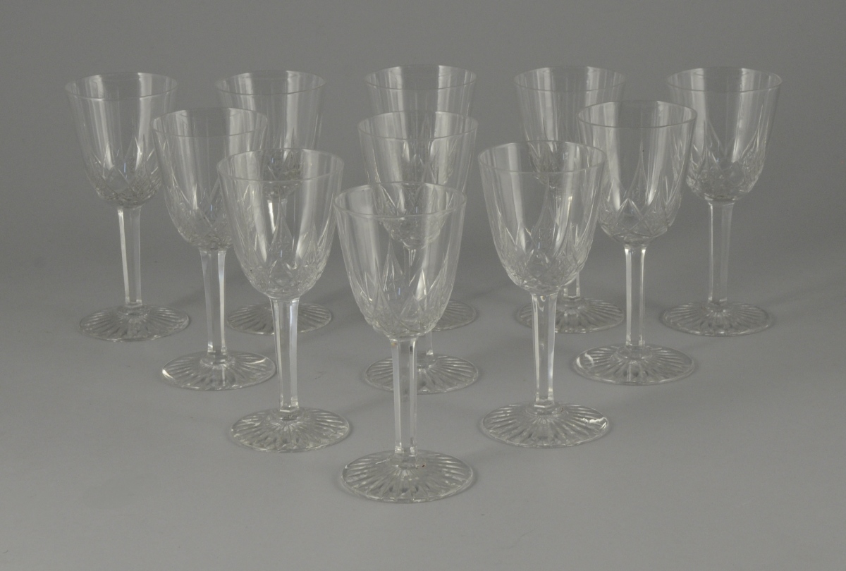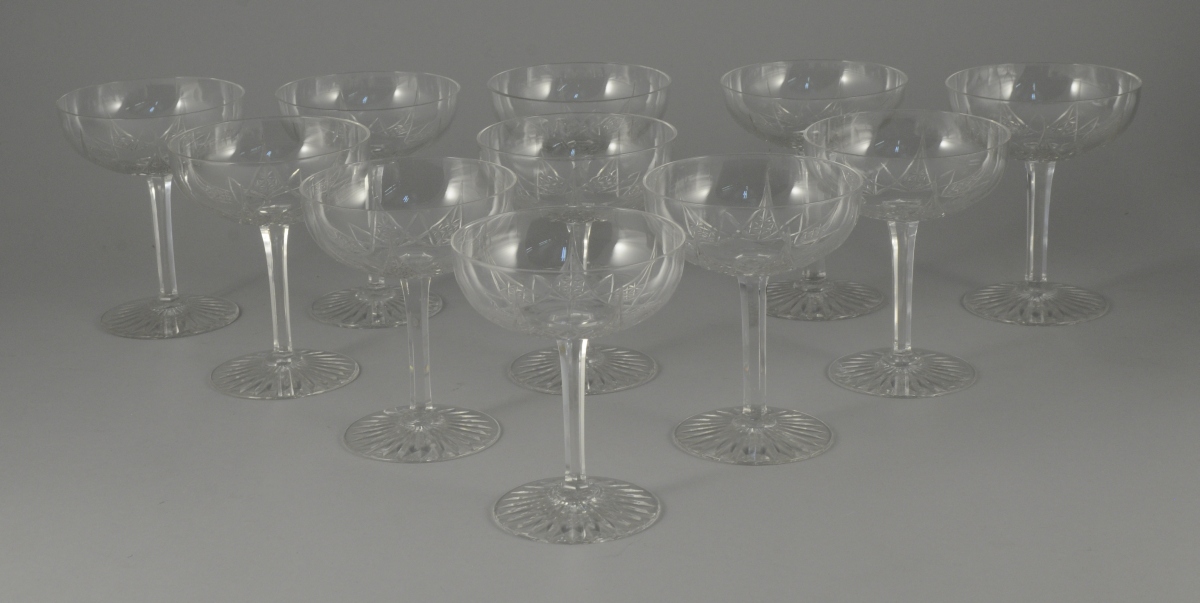4 CARAFES avec leur bouchon, 11 VERRES À EAU, 10 VERRES À VIN ROUGE, 11 VERRE À VIN BLANC, 11 COUPES À CHAMPAGNE et 12 PORTE-COUTEAUX. Vers 1925.