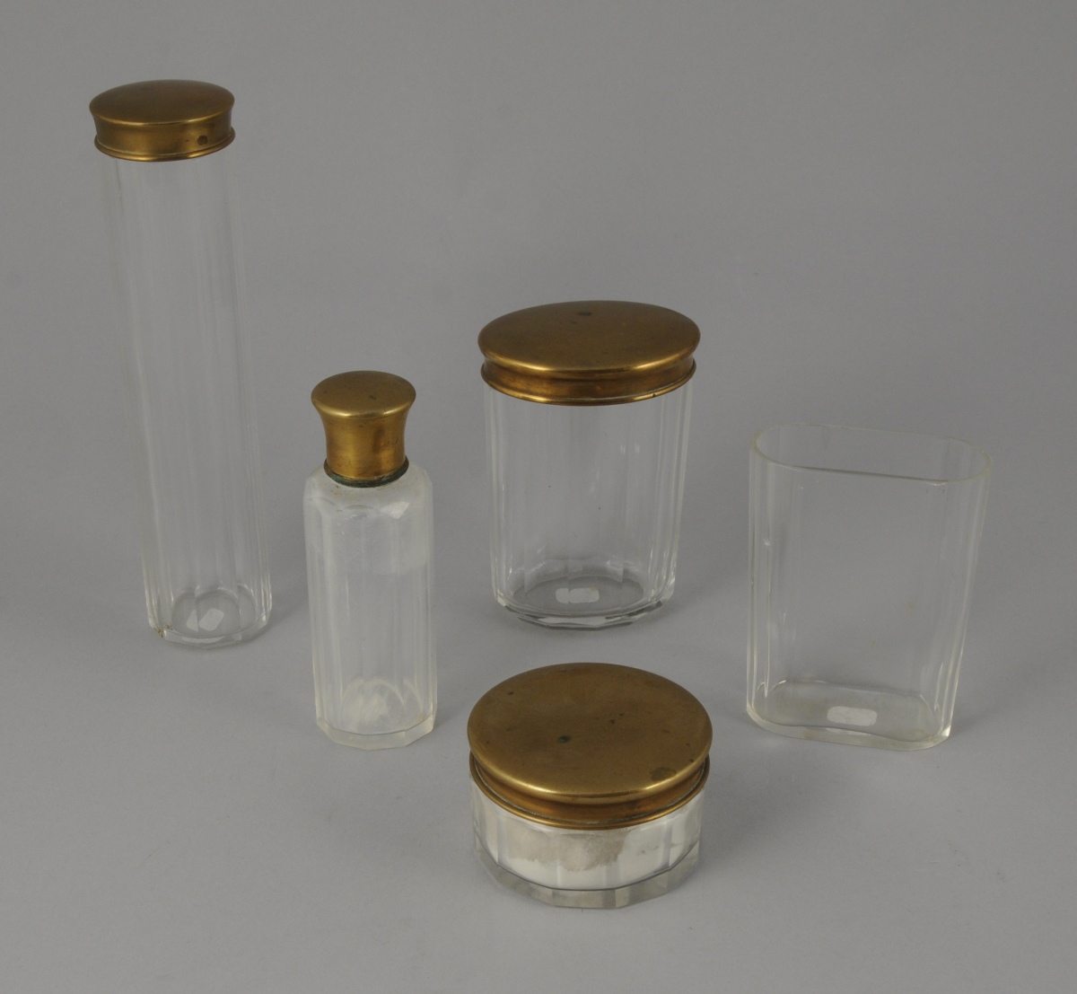NÉCESSAIRE DE TOILETTE composé de 5 pièces en verre à pans coupés, les garnitures en laiton. Il comprend 1 flacon à parfum, une boîte à poudre, 2 hautes boîtes et une boîte à coton.