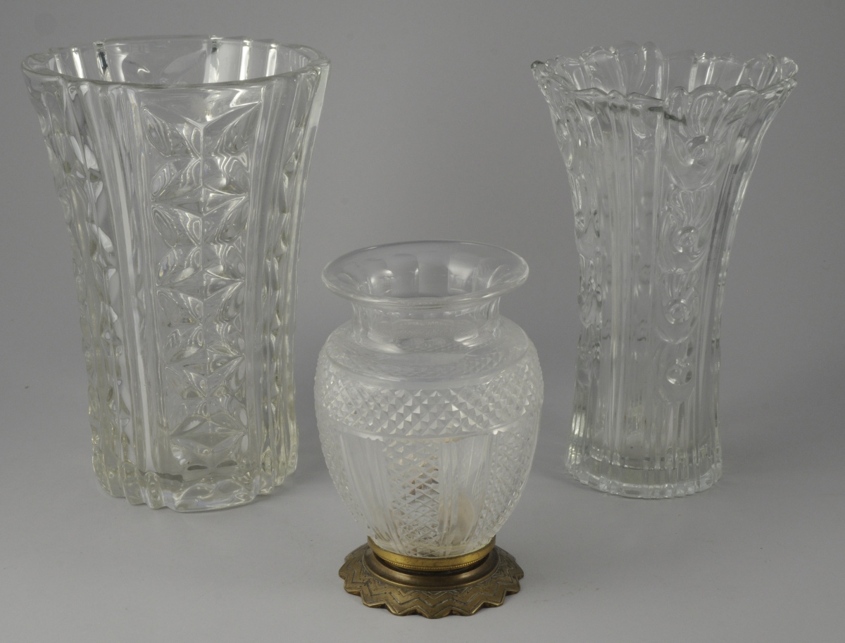 - VASE en verre translucide taillé. Monture en laiton. Milieu du XXème. Haut. 17, Diam. 10 cm.