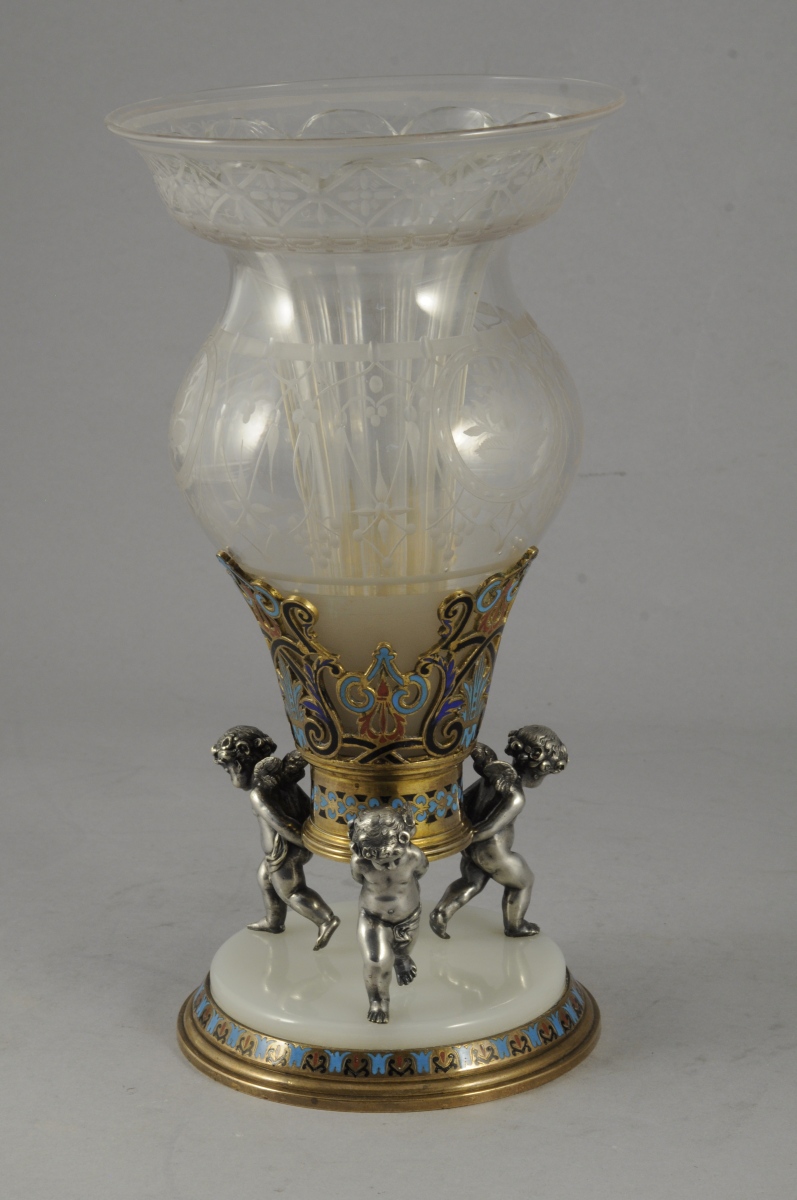 VASE en cristal gravé. Décor de bouquets fleuris dans des médaillons circulaires et d'entrelacs. Il est doublé d'un second réceptacle de forme tulipe, facetté à bord polylobé. Monture en bronze soutenue par trois chérubins en ronde-bosse. Décor ajouré de feuilles d'acanthe, entrelacs et rinceaux et émaillé bleu, rouge et noir. Socle circulaire.