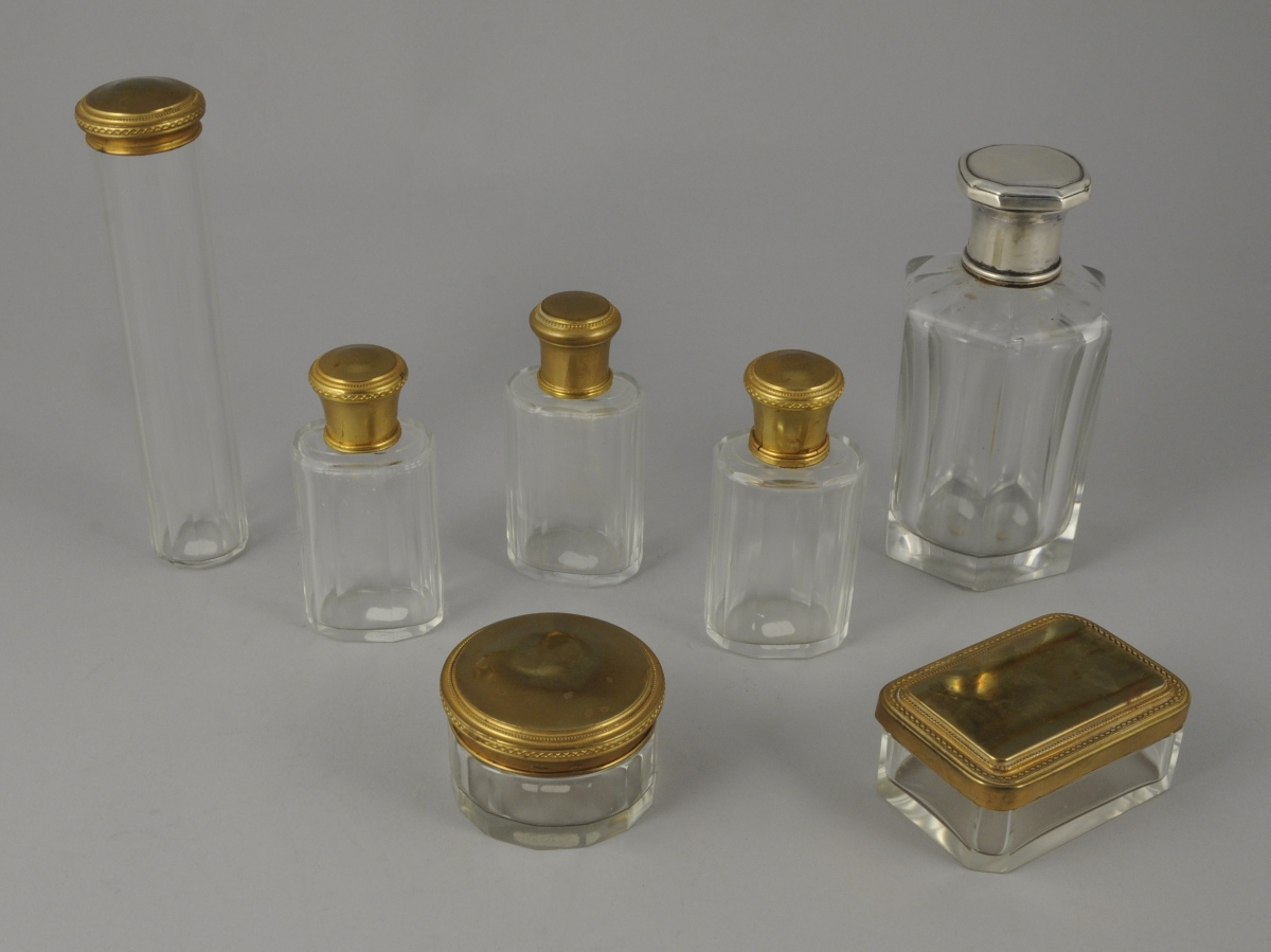 NÉCESSAIRE DE TOILETTE composé de 6 pièces en verre à pans coupés, les garnitures en métal doré. Il comprend 3 flacons à parfum, une boîte à poudre, une boîte oblongue et une boîte à coton.