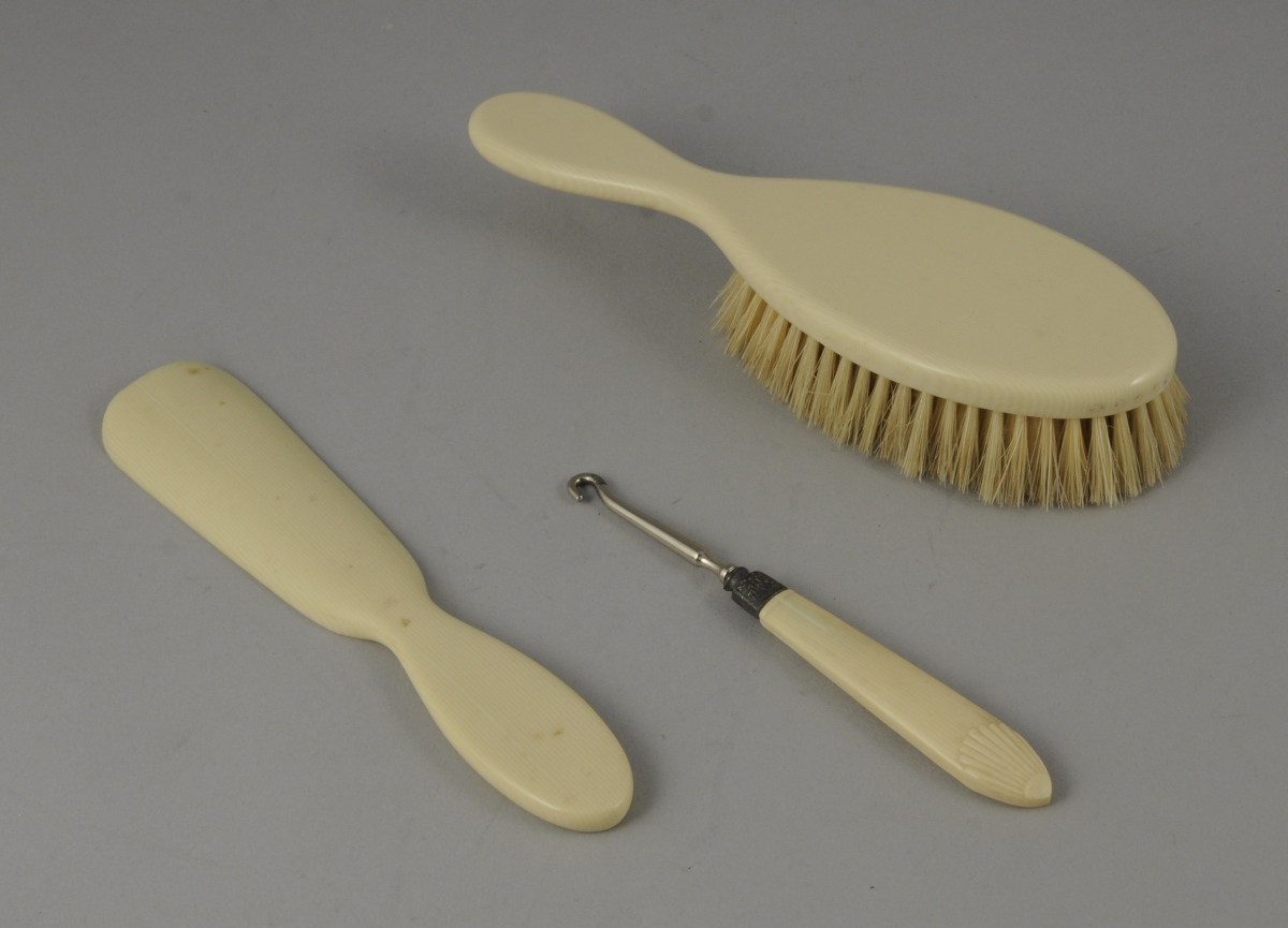 -une BROSSE À CHEVEUX, un CHAUSSE-PIED et un CROCHET À BOTTINES en matière imitant l'ivoire. Début du XXème.