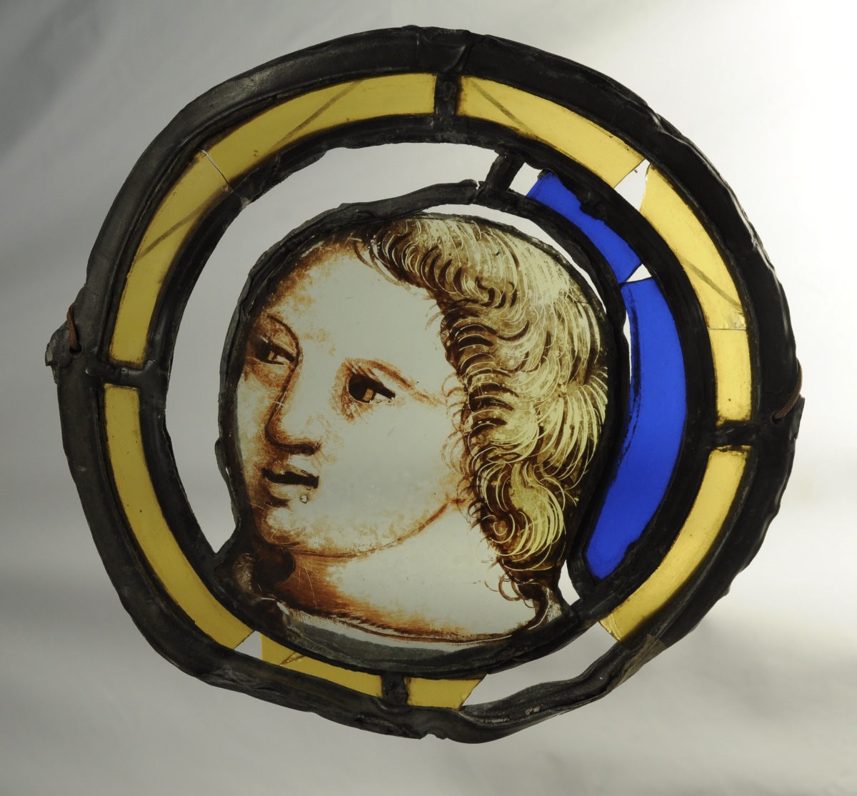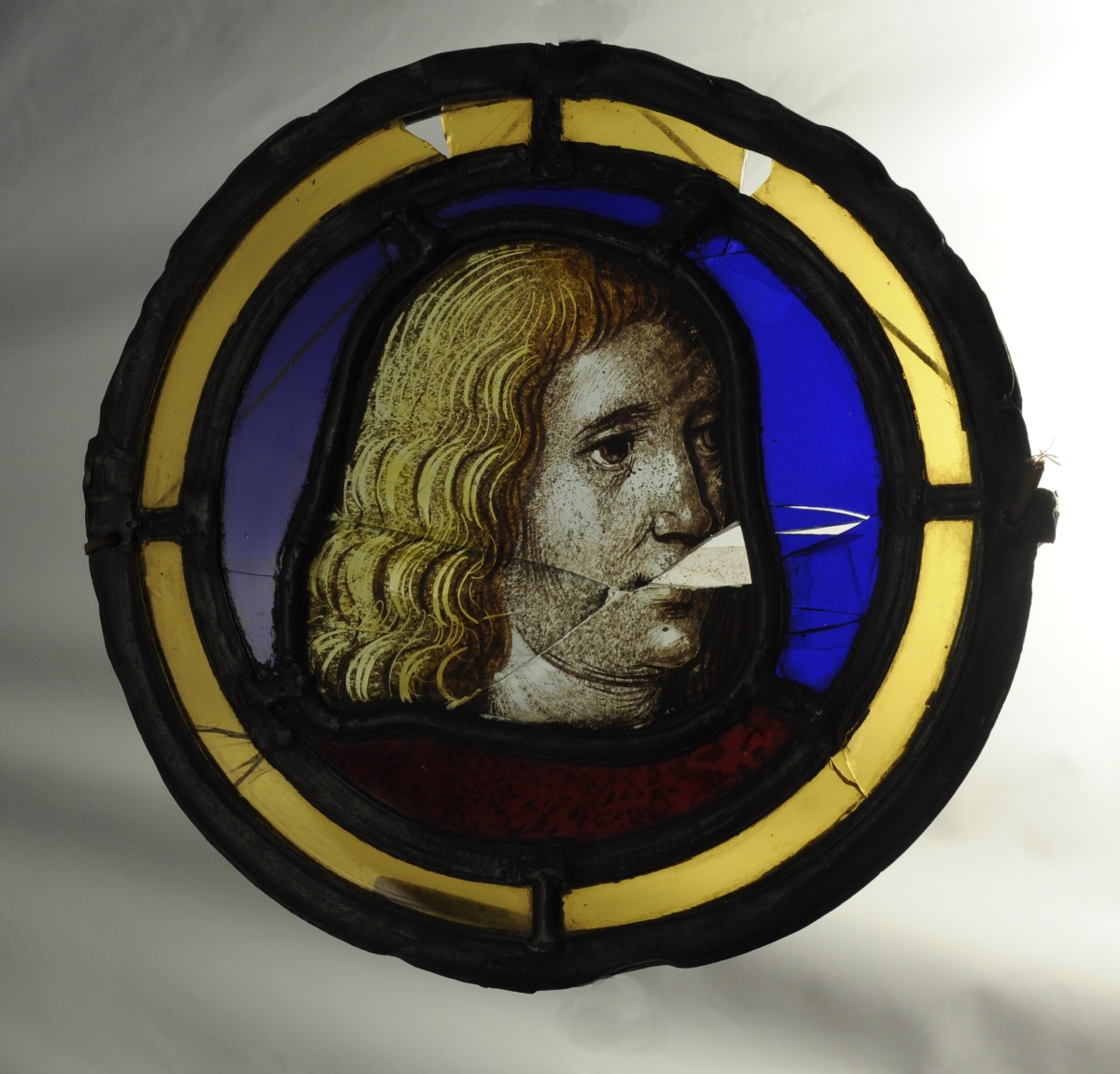 DEUX VITRAUX circulaires polychromes formant paire représentant deux portraits d'homme sur fond bleu et jaune. Travail français, XV - XVIème. Diam. 18 cm. (en l'état)