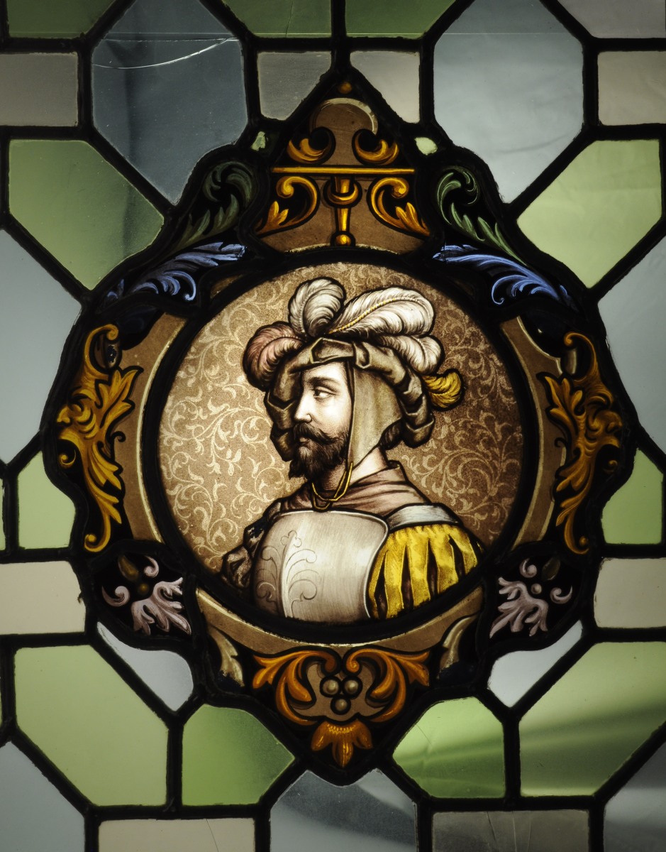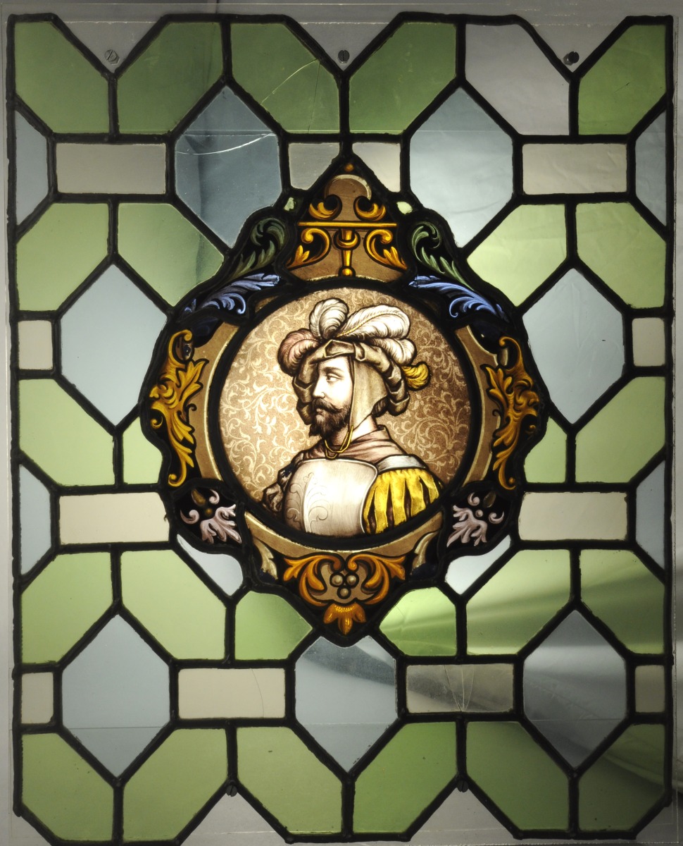 VITRAIL rectangulaire polychrome représentant un homme vêtu à la manière de la Renaissance dans un médaillon entouré de rinceaux feuillagés.