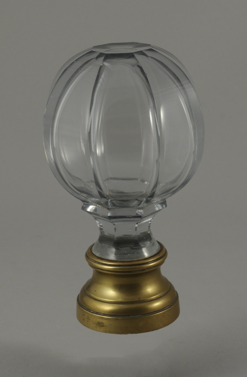 BOULE D'ESCALIER en verre facetté. Piedouche en laiton. Fin XIXème, début XXème. Haut. 15, Diam. 9 cm.