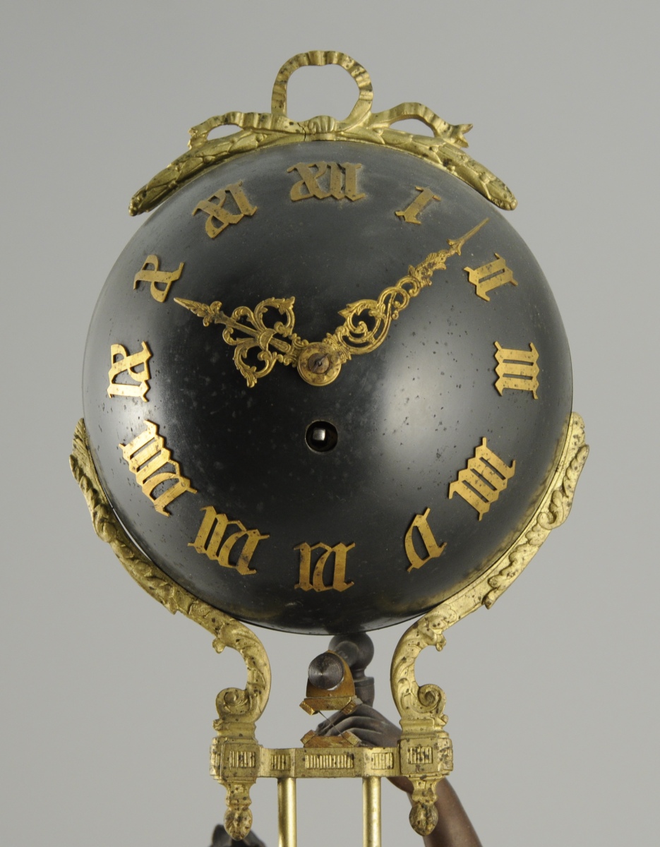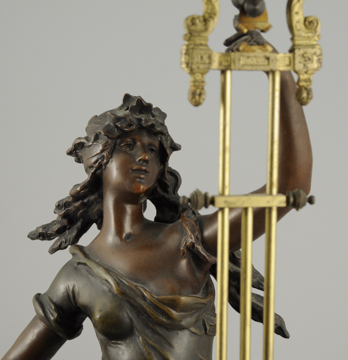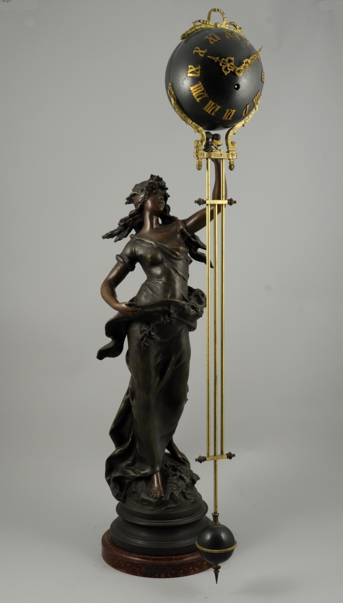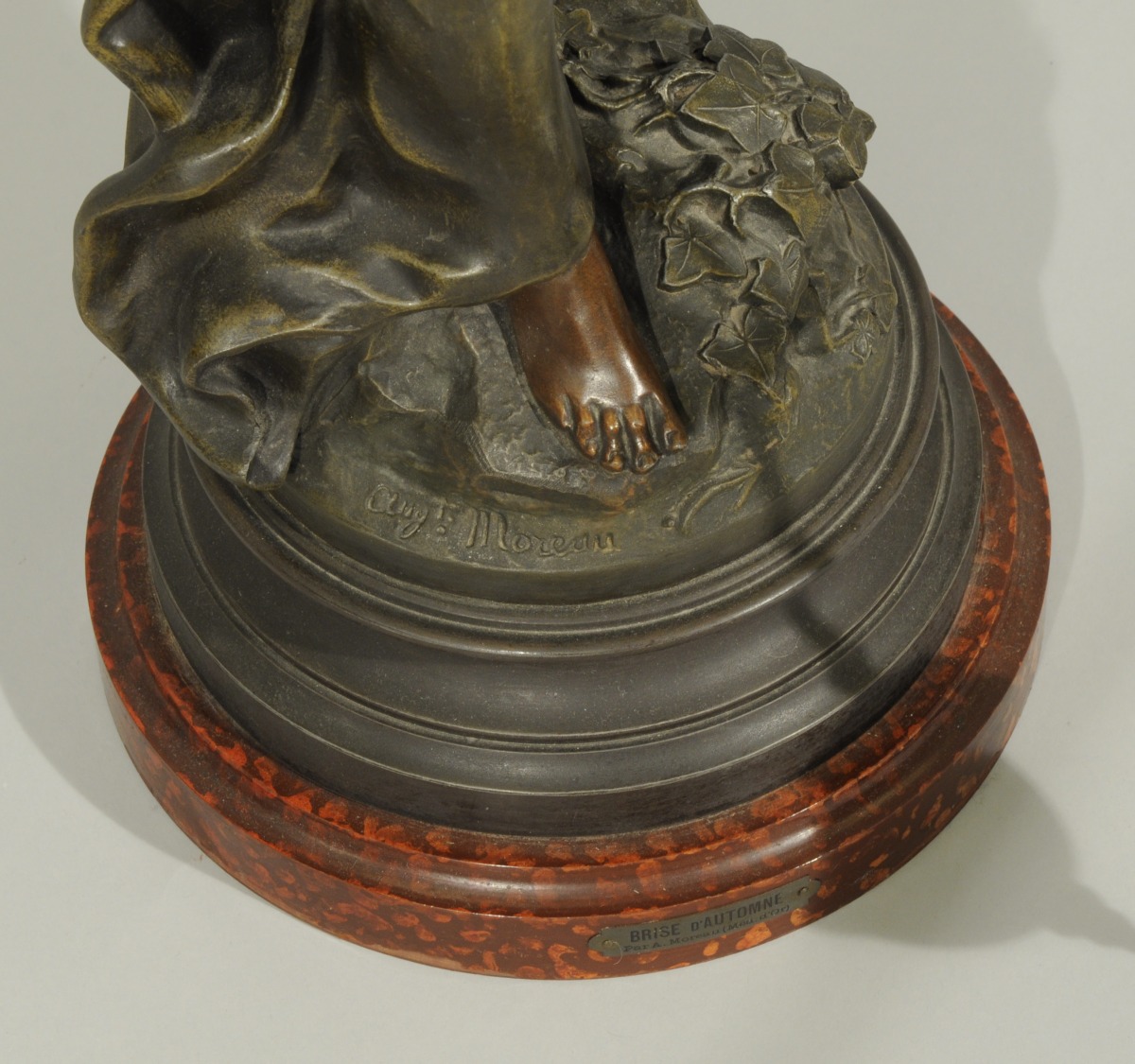 PENDULE en régule représentant une jeune femme vêtue à l'antique se tenant sur un tertre herbeux. Les cheveux, le drapé et le tertre ornés de branchages de lierre. Elle arbore dans sa main gauche un cadran sphérique et son balancier ornés de tores de laurier noué et de rinceaux feuillagés. Base moulurée. Socle circulaire en marbre rouge. Signée sur la terrasse " Aug. Moreau ". Cartouche marqué "Brise d'automne par Auguste Moreau (médaille d'or)".