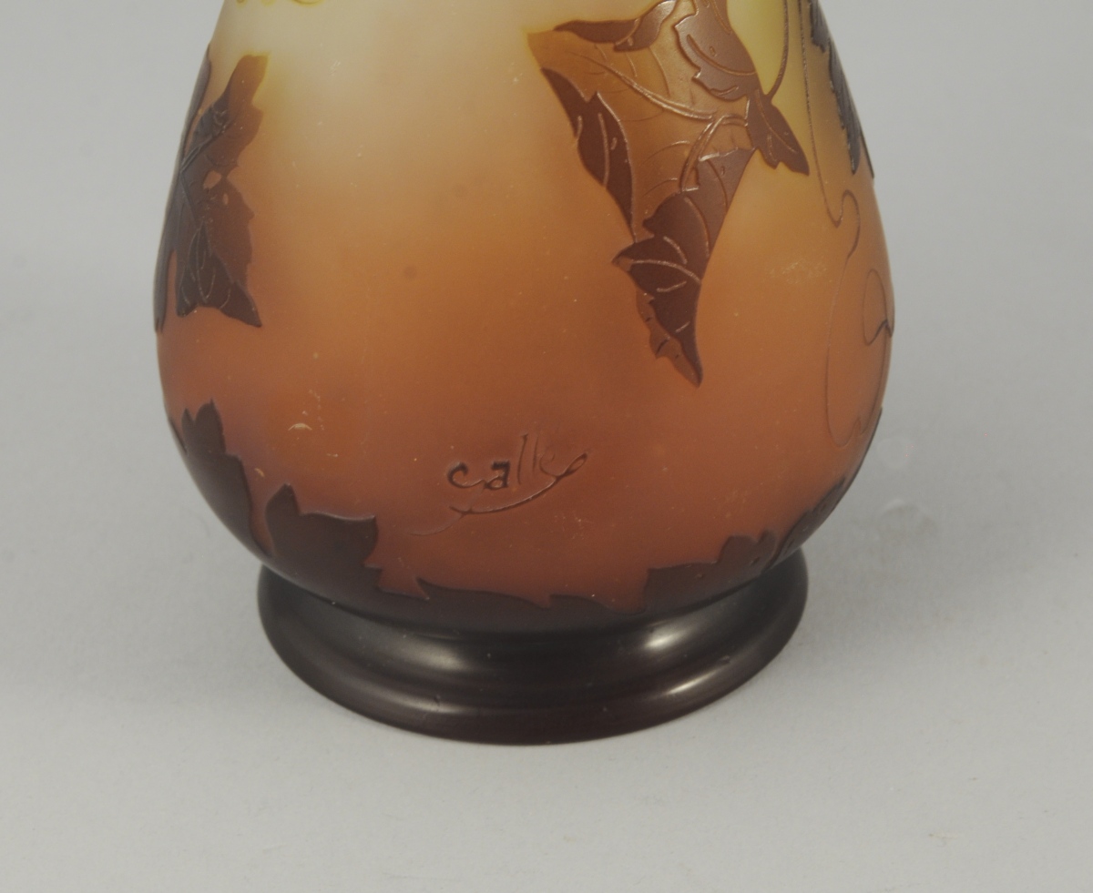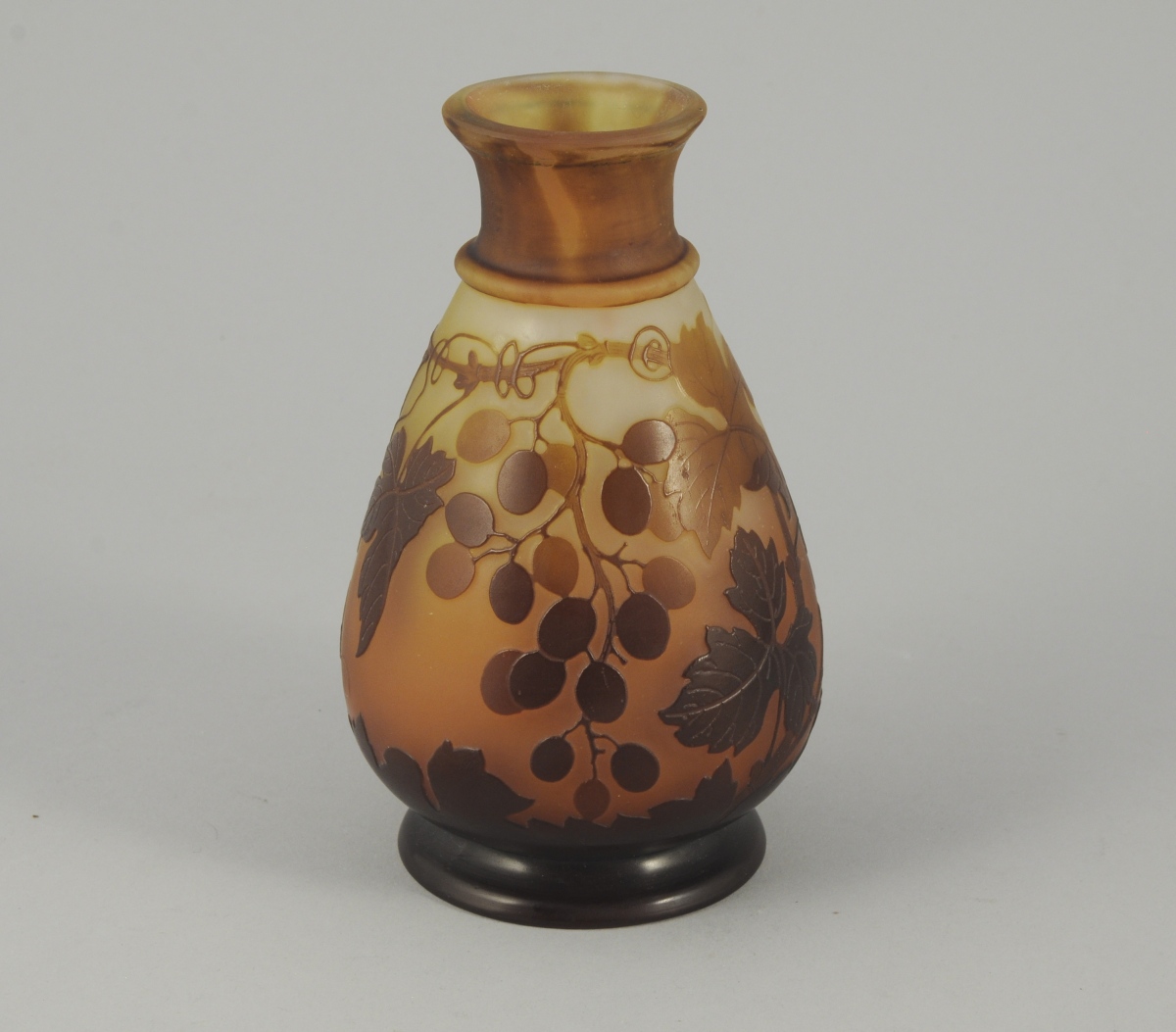 Émile GALLÉ (1846 -1904). VASE piriforme à col étranglé en pâte de verre à décor de feuillages et de pampres de couleur brunes dégagés à l'acide. Signé. Vers 1900. Haut. 15, 5 cm. Diam. 7 cm.
