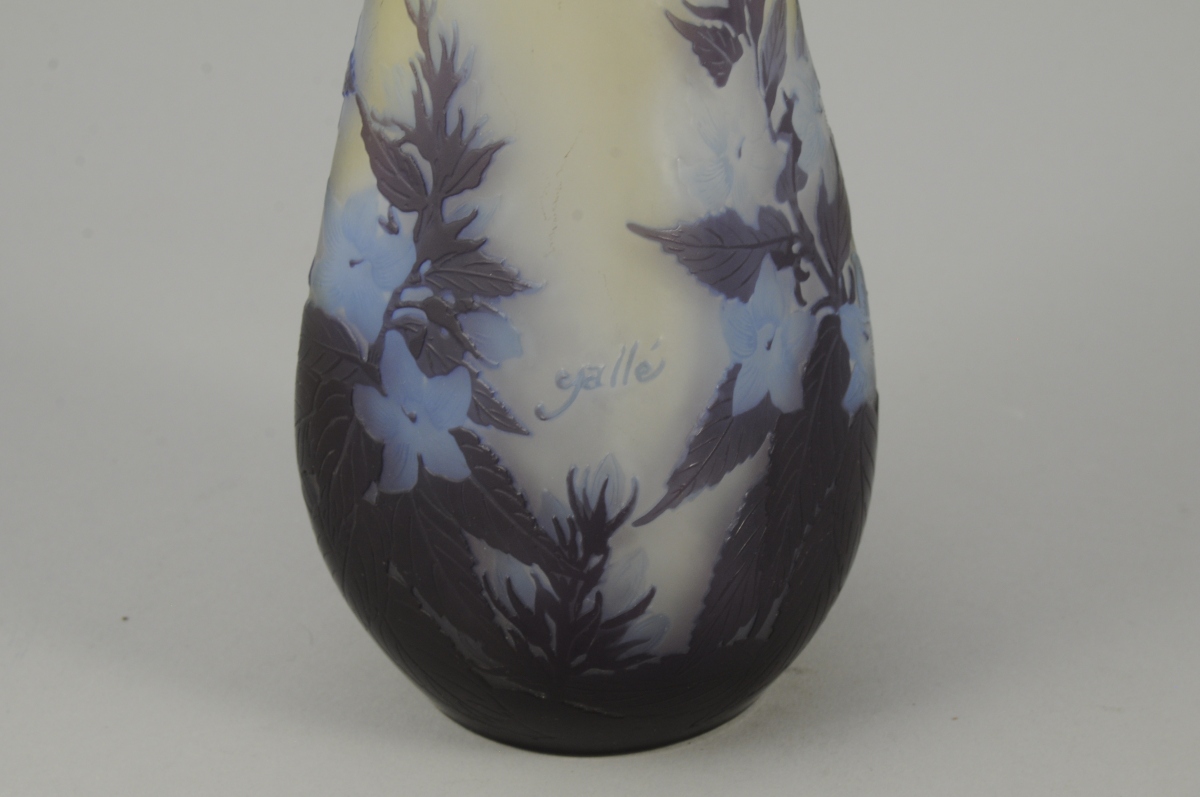 Émile GALLÉ (1846 -1904). VASE tronconique méplat à col étranglé en pâte de verre à décor de campanules de couleur violacée dégagés à l'acide. Signé. Vers 1900. Haut. 23, 5 cm. Larg. 8,6 cm.