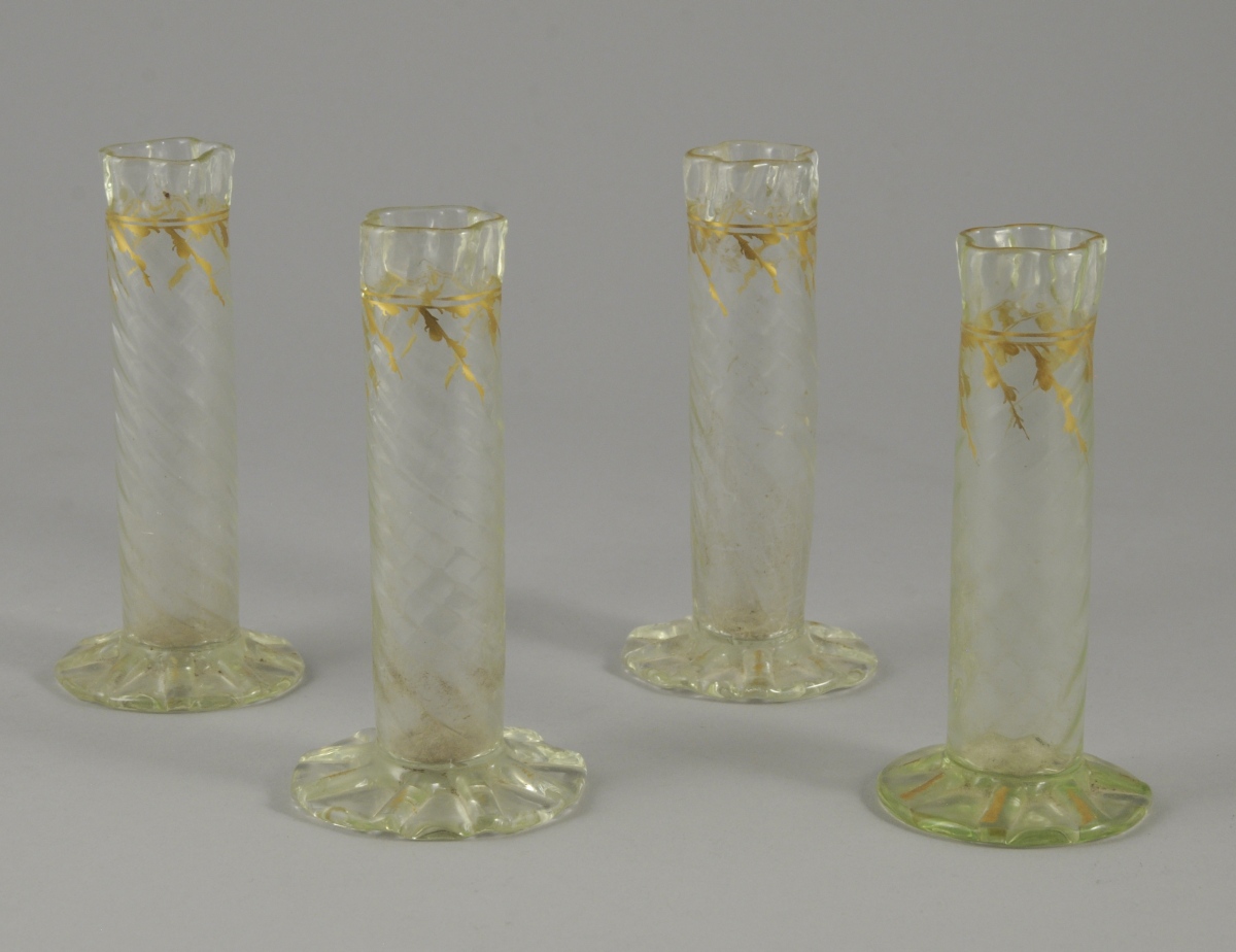 ENSEMBLE de QUATRE PETITS VASES tubulaires à côtes torses en verre translucide. Décor de filets et branchages or.