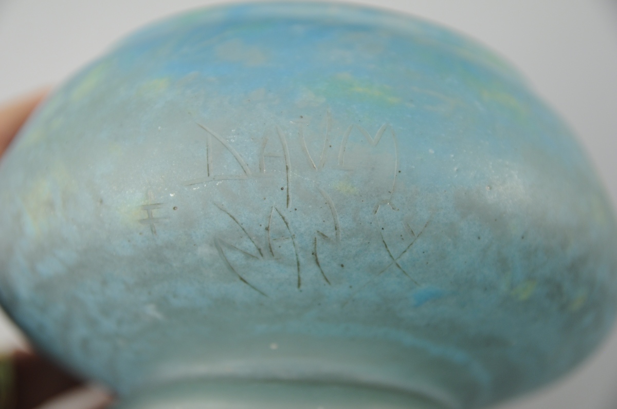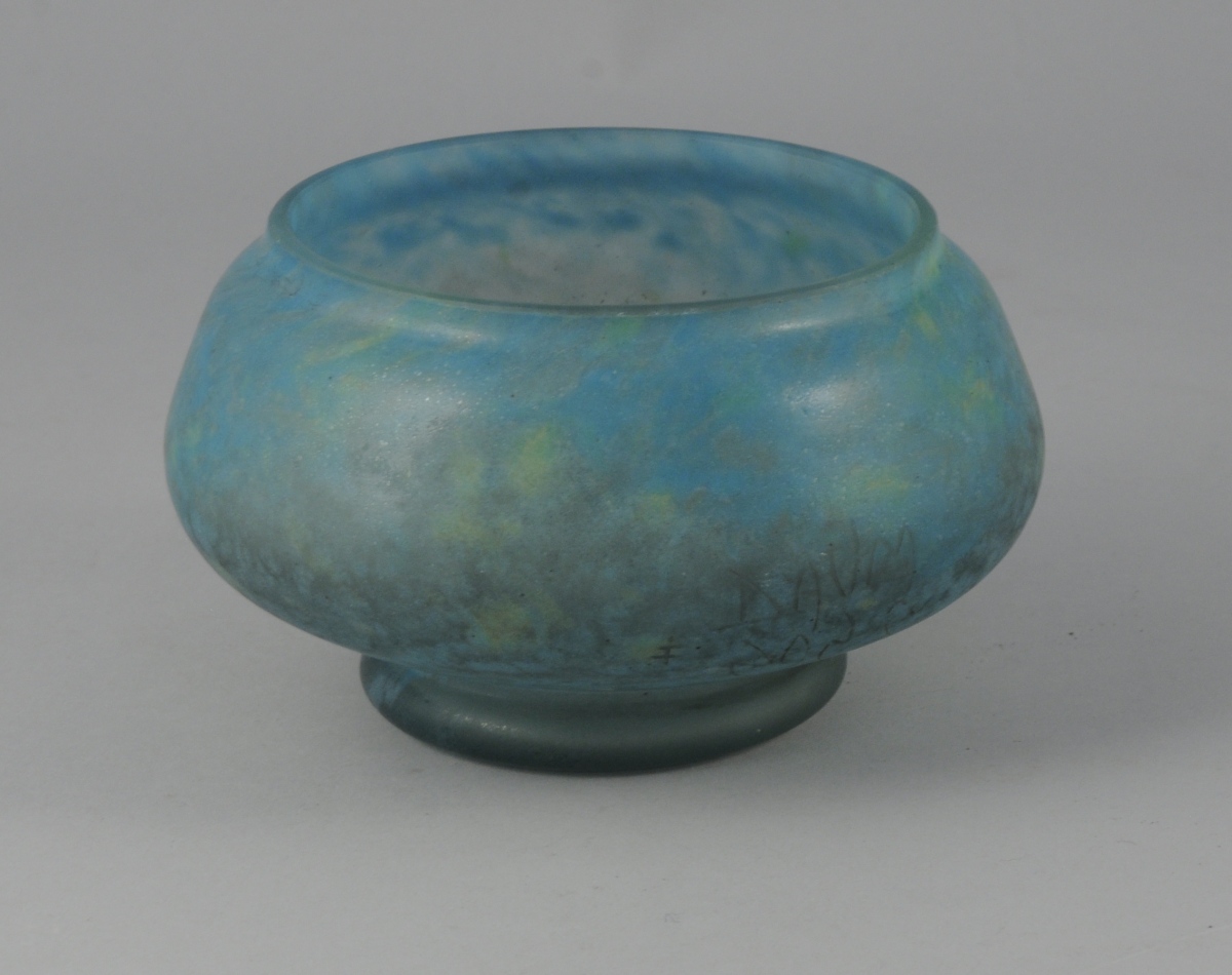 DAUM. PETIT VASE de forme ronde à panse basse en verre marmoréen bleu. Il pose sur un talon. Signé "DAUM NANCY".