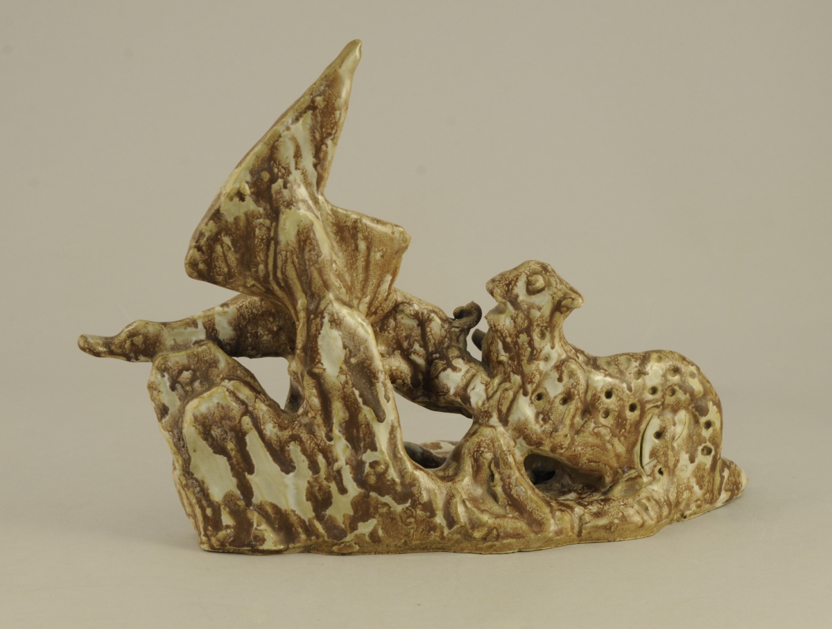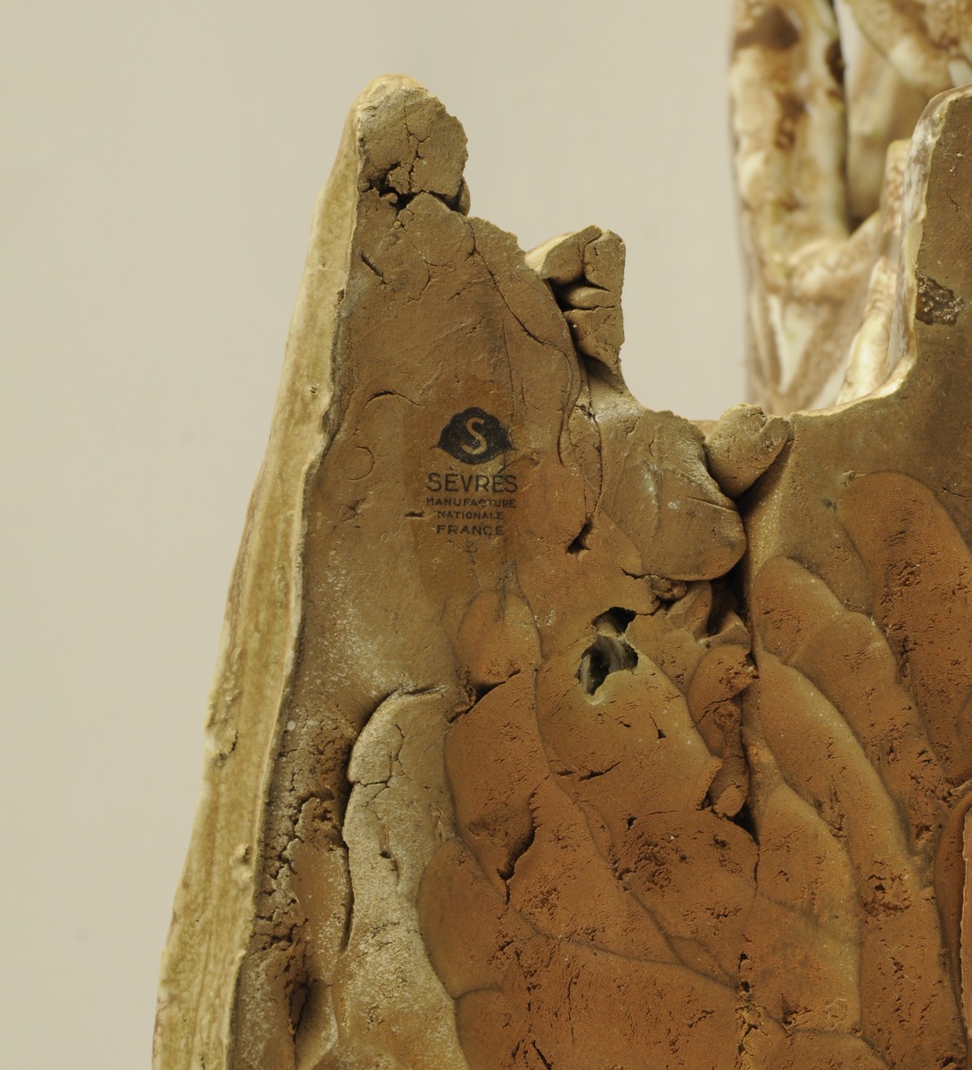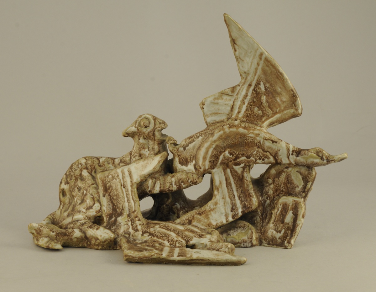 Mathurin MÉHEUT (1882-1958) et SÈVRES. "Chat sauvage et canards". Sujet en terre crue émaillée brune et crême. Marque de la Manufacture Nationale de Sèvres. Haut. 26,2, Long. 37, Prof. 16,5 cm.