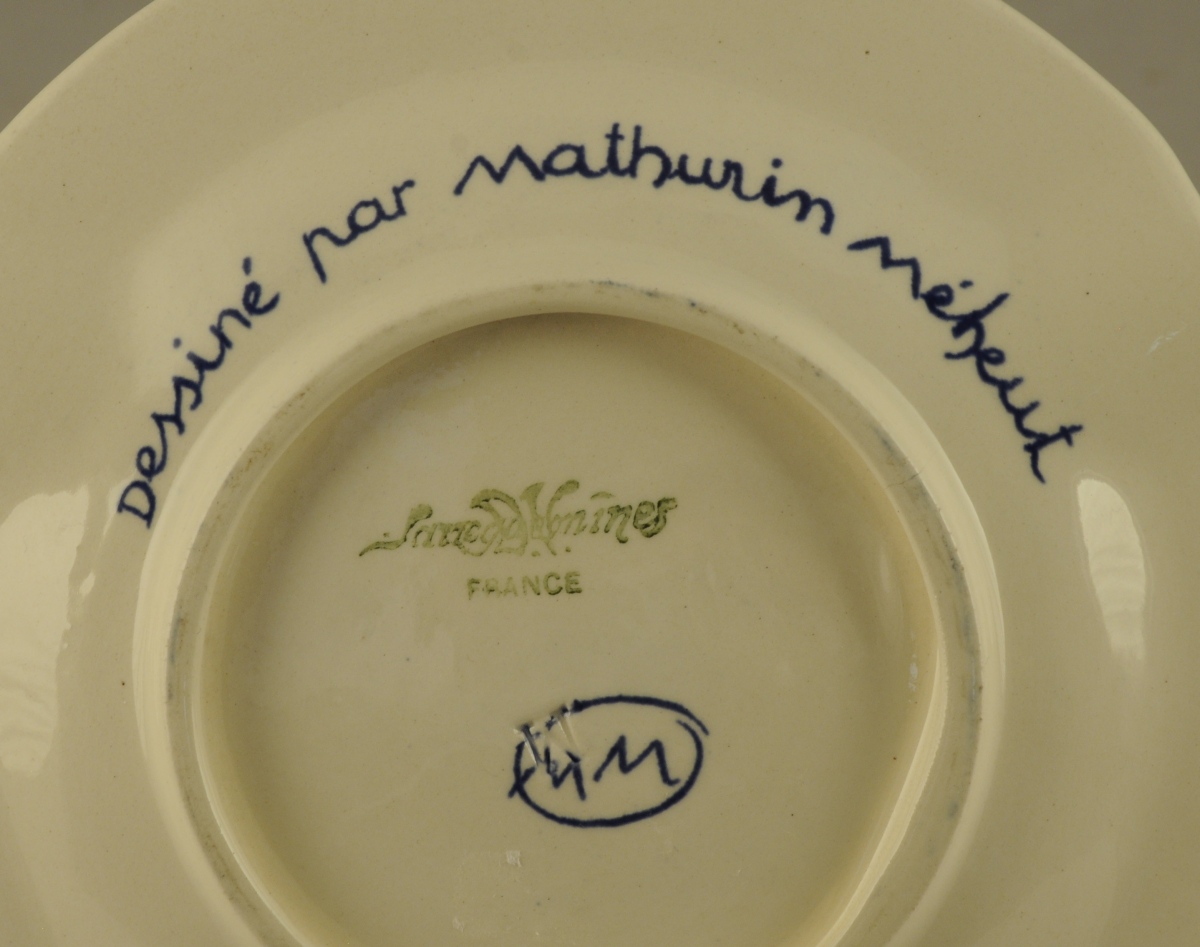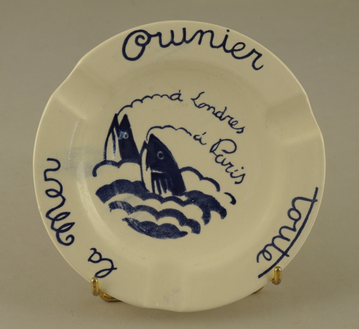 Mathurin MEHEUT (1882-1958) et SARREGUEMINES. Cendrier de la maison Prunier de Paris en faïence fine à fond crème. Décor camaïeu bleu de deux poissons émergeant des flots et des inscriptions "A Londres / A Paris" et "Toute la mer / Prunier". Marque au tampon "Sarreguemines / France", marque "MM" et "M" en creux pour Mathurin Méheut et inscription "Dessiné par Mathurin Méheut" au revers. Diam. 15,2 cm.