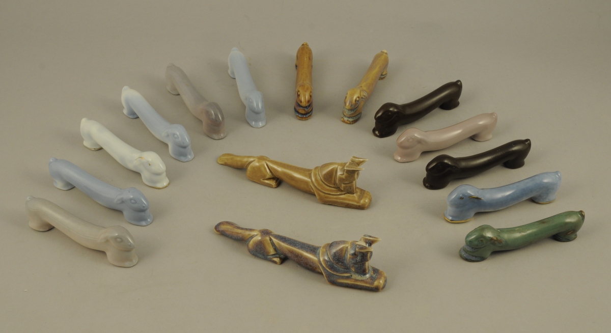 Jacques PERRIN (né à Tours en 1920) pour l'Ecole Nationale Professionnel de Vierzon dans les années 1937-1939. 15 PORTE-COUTEAUX DE CHASSE en porcelaine blanche, bleue, ocre, prune et parfois rehaussée à l'or comprenant 13 lapins (Long. 11 cm) et deux renards ( Long. 15,5 cm). Non signés.