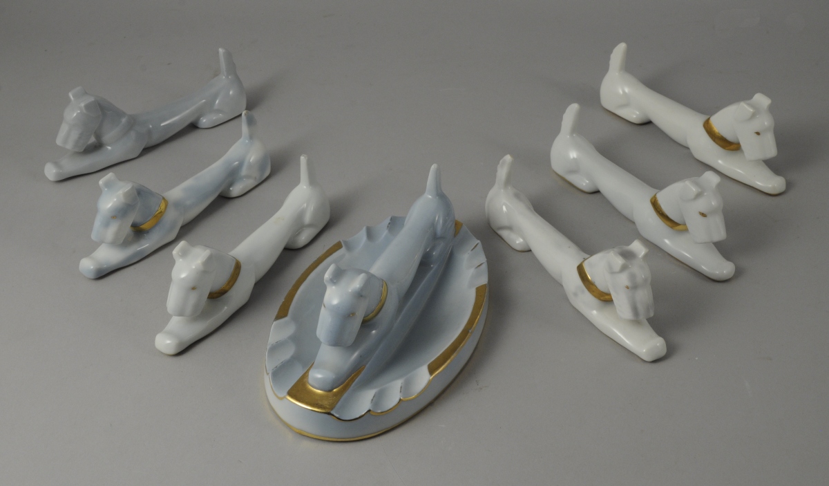 Jacques PERRIN (né à Tours en 1920) pour l'Ecole Nationale Professionnel de Vierzon dans les années 1937-1939. CENDRIER FOX TERRIER et SIX PORTE-COUTEAUX FOX TERRIER en porcelaine blanche ou bleutée rehaussée d'or.