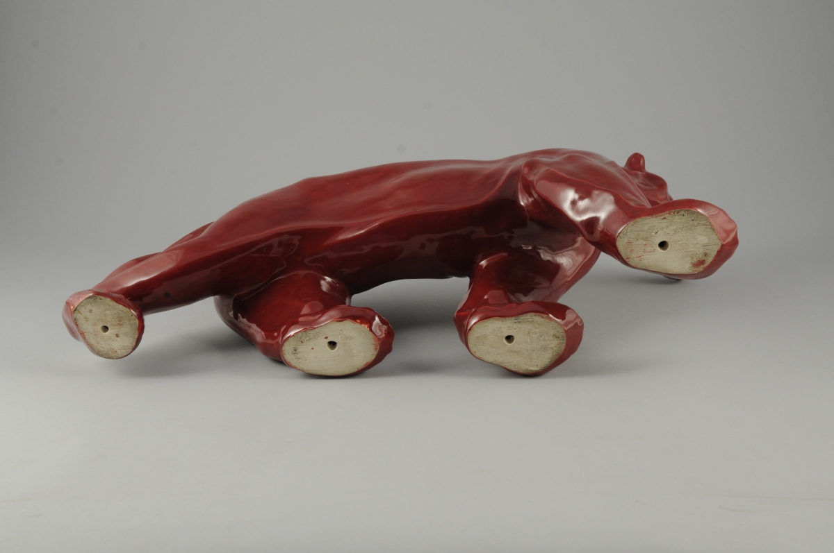Faïence émaillée rouge, signée sous l'antérieur gauche "S.R. BONOME / PARIS" et sous le postérieur gauche "S.R.B".