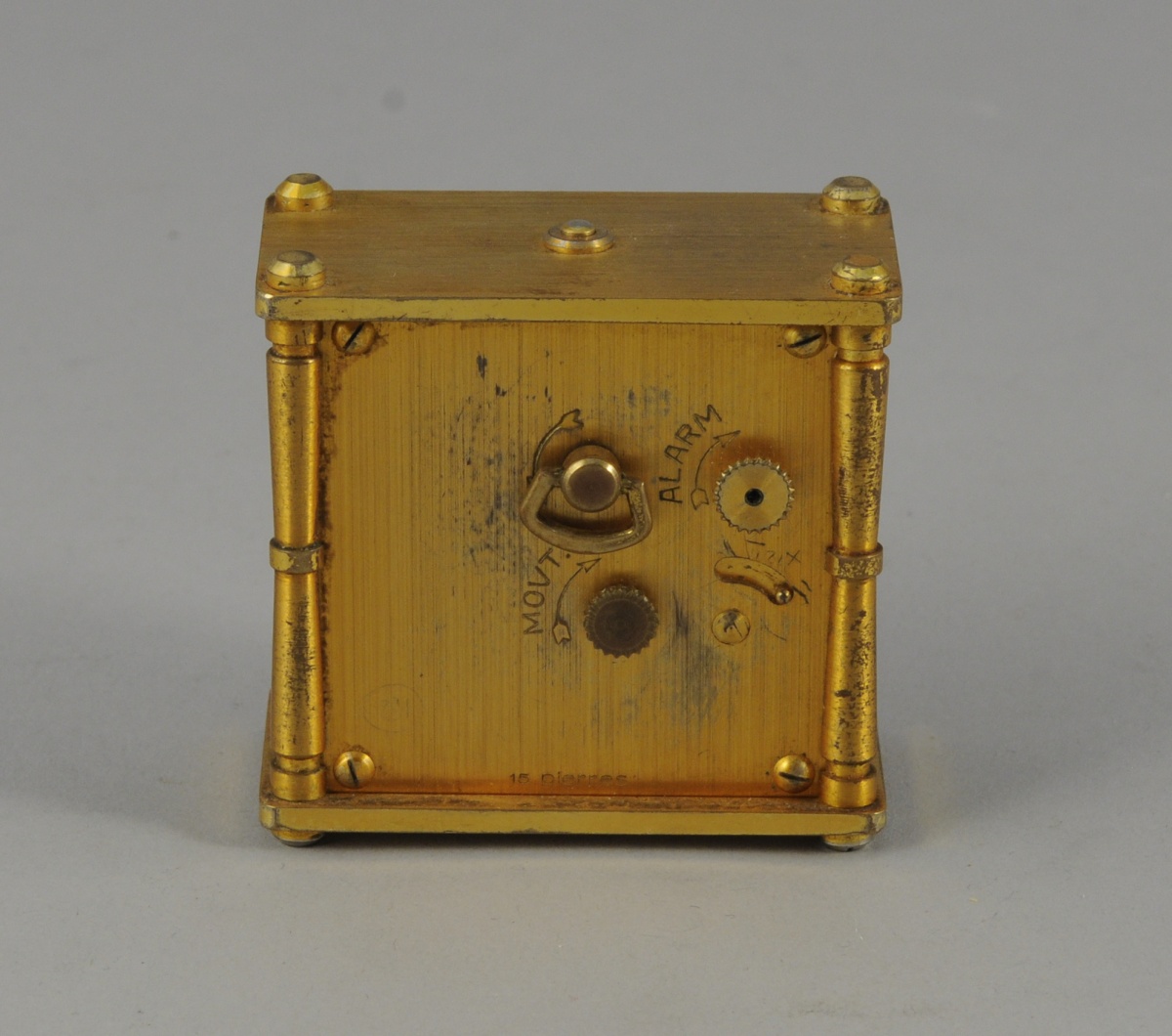 JAEGER. Pendulette à double cadran heures et secondes. Cage en métal doré présentant quatre colonnettes cintrées. Mention "Fabriqué en Suisse". XXème.
