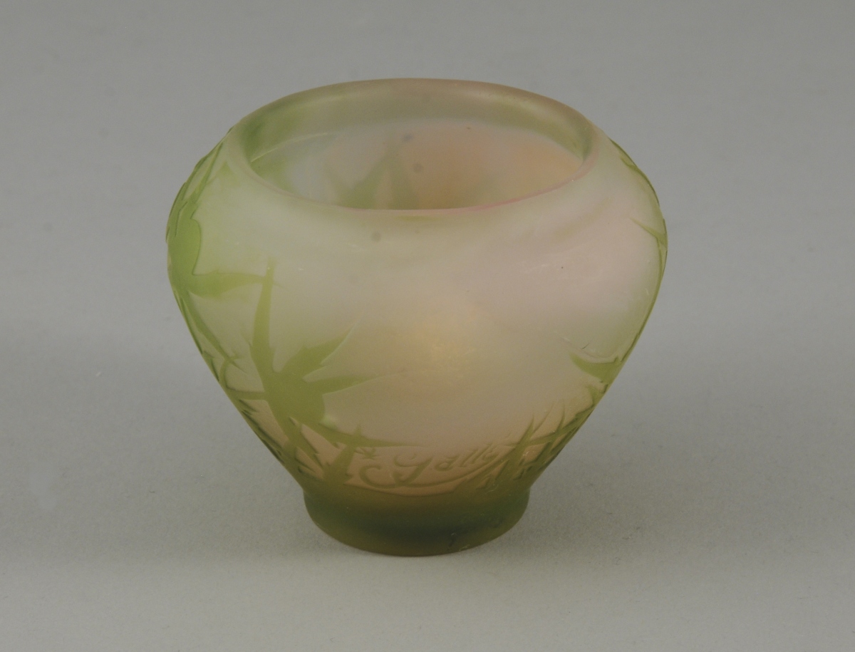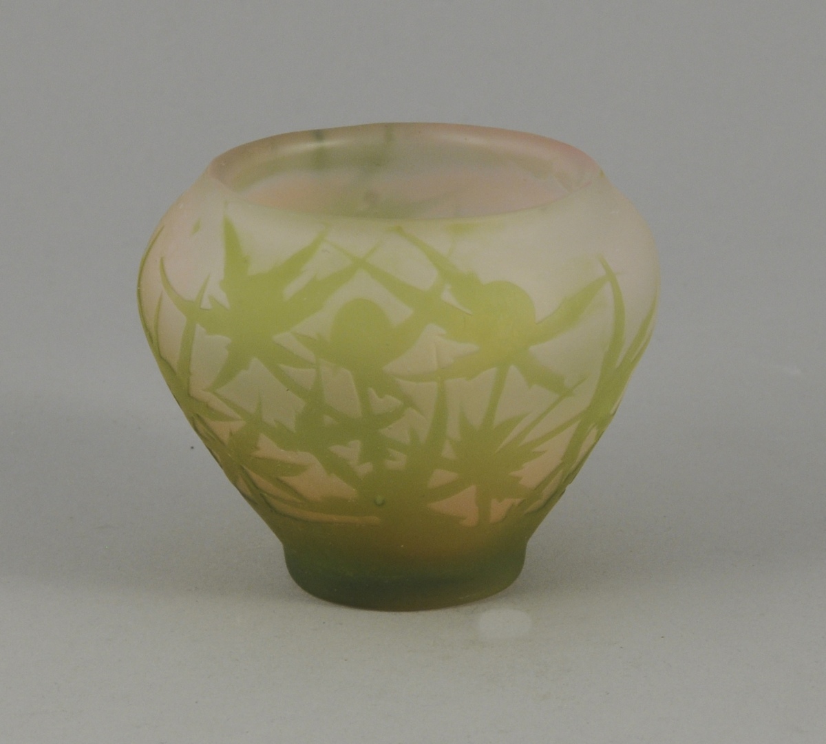 GALLÉ. Petit vase de forme toupie à forte épaule en verre bicouche. Décor en vert dégagé à la roue de chardons sur fond rosé.
