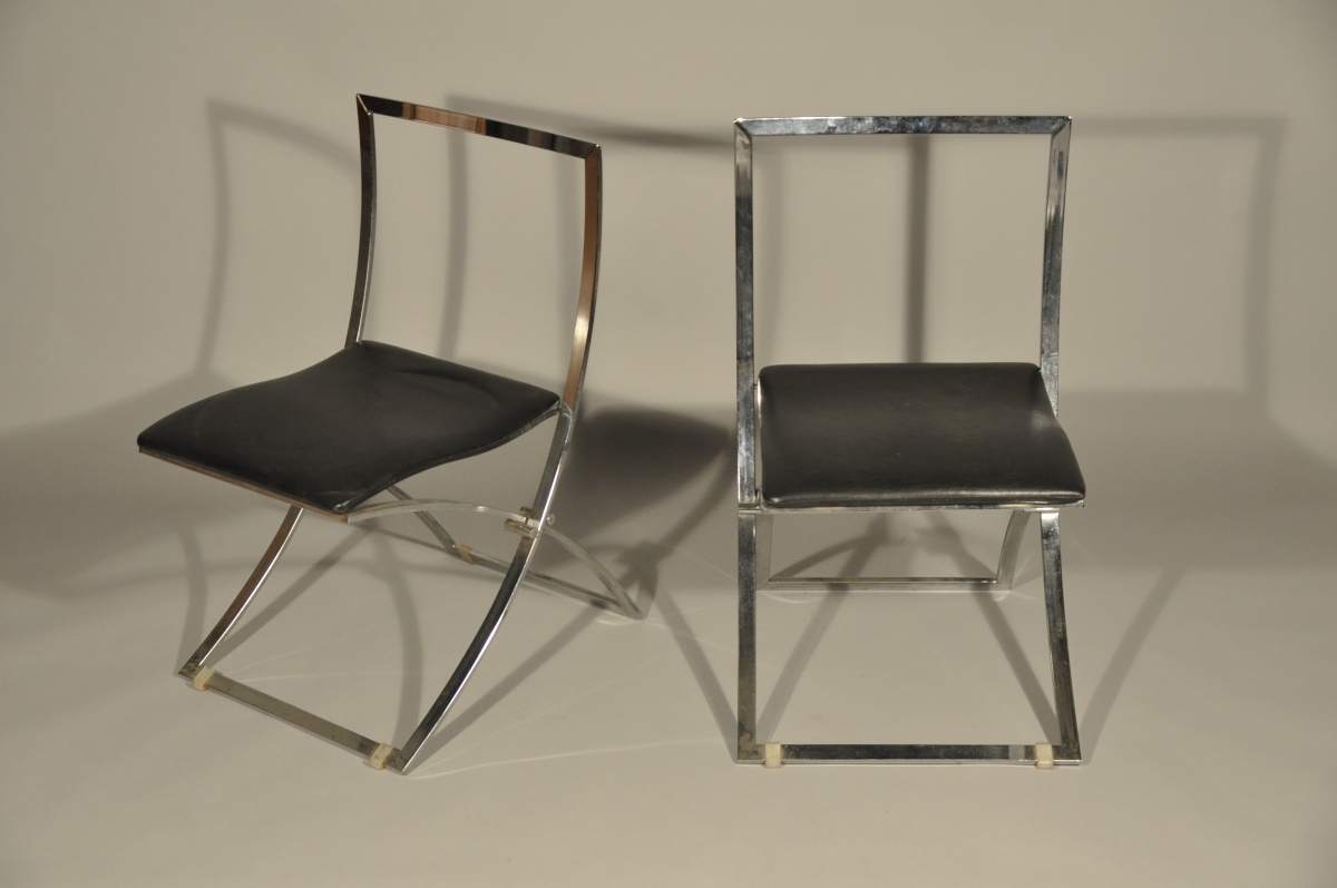 PAIRE de CHAISES pliantes en métal chromé. Assise en cuir noir.