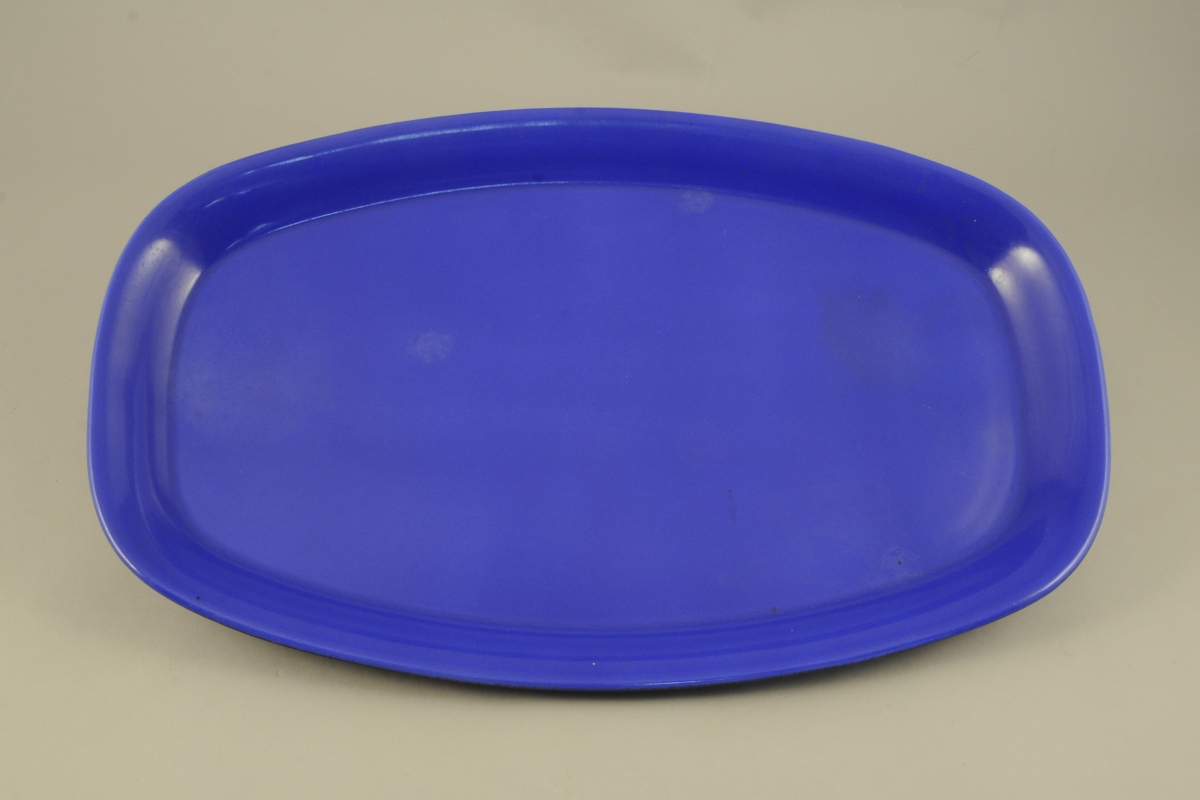 - PLAT ovale en faïence émaillée bleu à l'avers et noir au revers. Marque en creux au revers. Années 1950 - 1960. Long. 53,5, Larg. 33,5 cm.