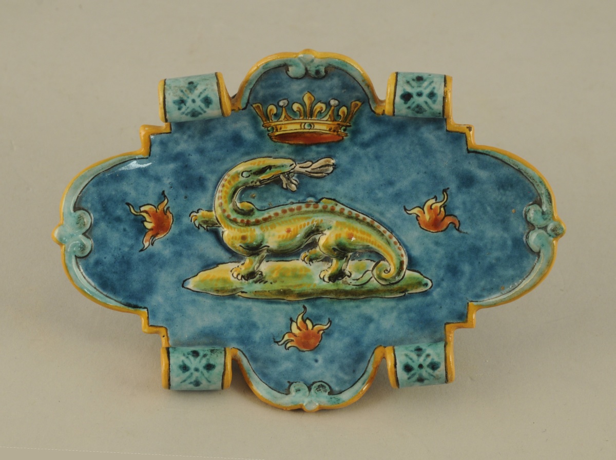 BLOIS. Manufacture BRUNEAU. CENDRIER polylobé en faïence polychrome représentant la Salamandre du Roi François Ier en bas relief sur fond bleu turquoise poudré. Marque "Ulysse / Blois / G Bruneau Balon / Seur d' E. Balon ". Style Renaissance, circa 1930. Long. 14, Larg. 10 cm.