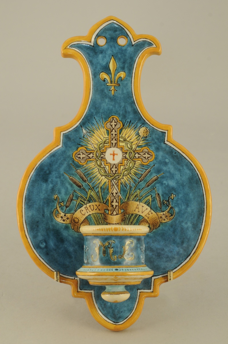 BLOIS. Manufacture Balon. BÉNITIER d'applique en faïence. Décor polychrome à la Croix, Couronne d'épines et philactère portant l'inscription "O Crux Ave" sur fond bleu turquoise poudré, filets blancs et jaunes sur le bord. Marqué du monogramme "ML" sur le réceptacle. Marqué "Ulysse / Blois / E. Balon Soeurs / 16 Juin 1938". Style Renaissance.