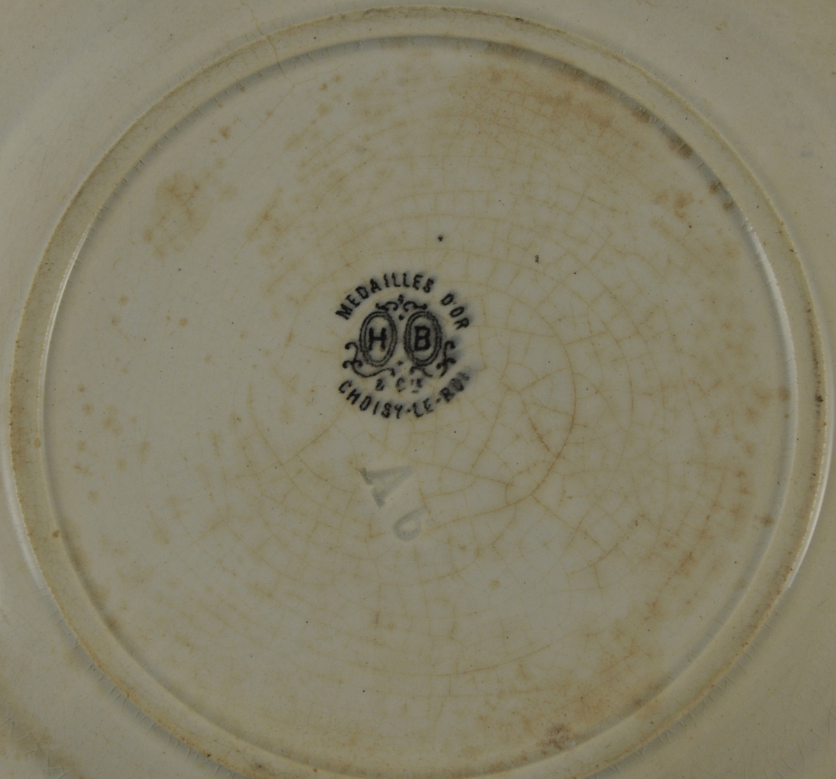CHOISY-LE-ROI. Ensemble de TROIS ASSIETTES en faïence fine "Le Langage des Fleurs", décor imprimé en noir et bleu de scènes humoristiques légendées "2. La Marguerite Innocente / 5. Le Laurier Gloire / 11. La Rose capucine Qui s'y frotte s'y pique". Frises de rubans, perles, rosaces, torsades et filets. Marque au tampon "Médailles d'or / HB et Cie / Choisy-le-Roi" et en creux "A6".