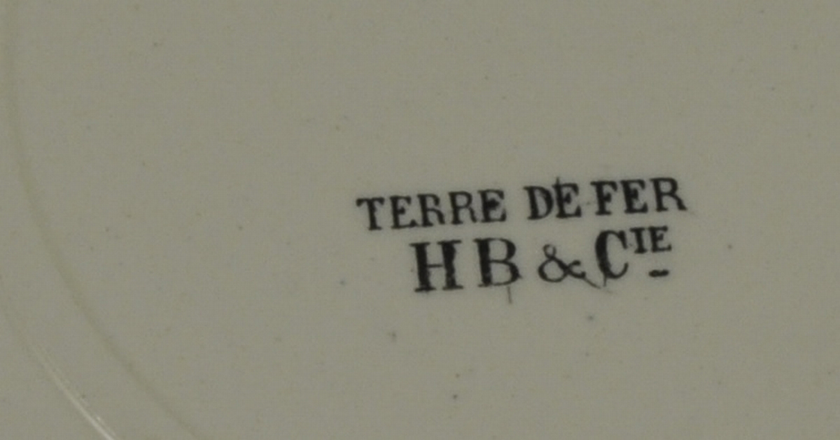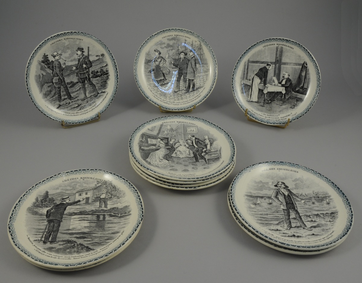 CHOISY. Série de ONZE ASSIETTES en faïence fine "Galejades marseillaises", décor imprimé en noir et vert de scènes humoristiques. Bordure à frise de fleurs. "Terre de Fer, HB et Cie".