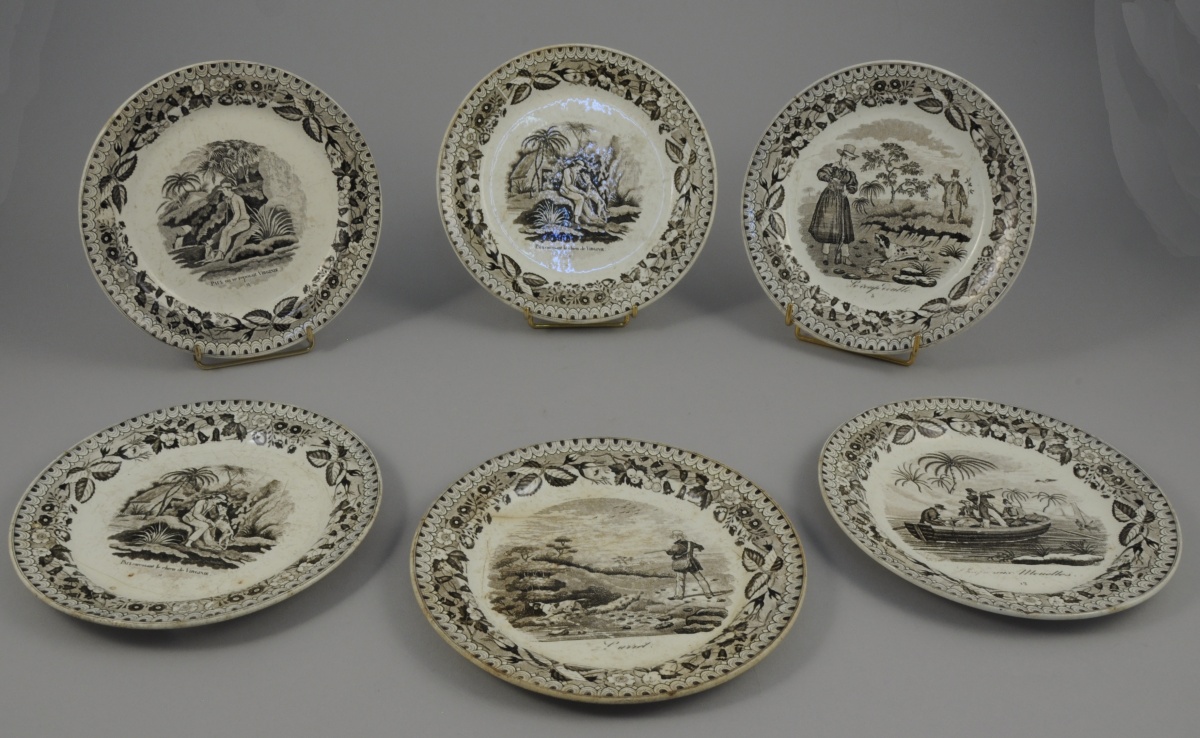 CHOISY. Série de SIX ASSIETTES en faïence fine à décor imprimé en brun d'après Bernardin de Saint-Pierre "Paul et Virginie". Aile à frise florale. Marque en creux à l'écusson.