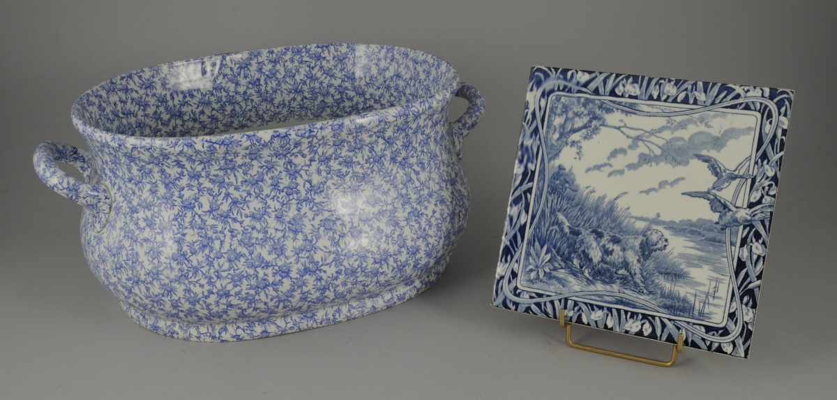 JOINT: CARREAU en faïence. Décor camaïeu bleu d'une scène de chasse aux canards. Larg. 20 cm.